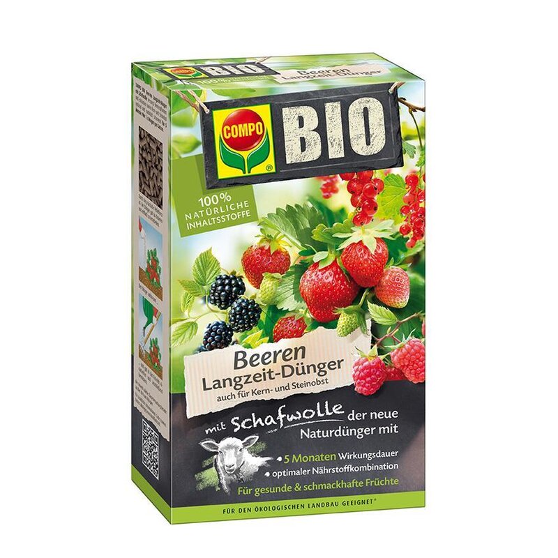 - Der Compo BIO Beeren Langzeit-Dünger mit Schafwolle eignet sich hervorragend für alle Beerenpflanzen sowie Kern- und Steinobst.