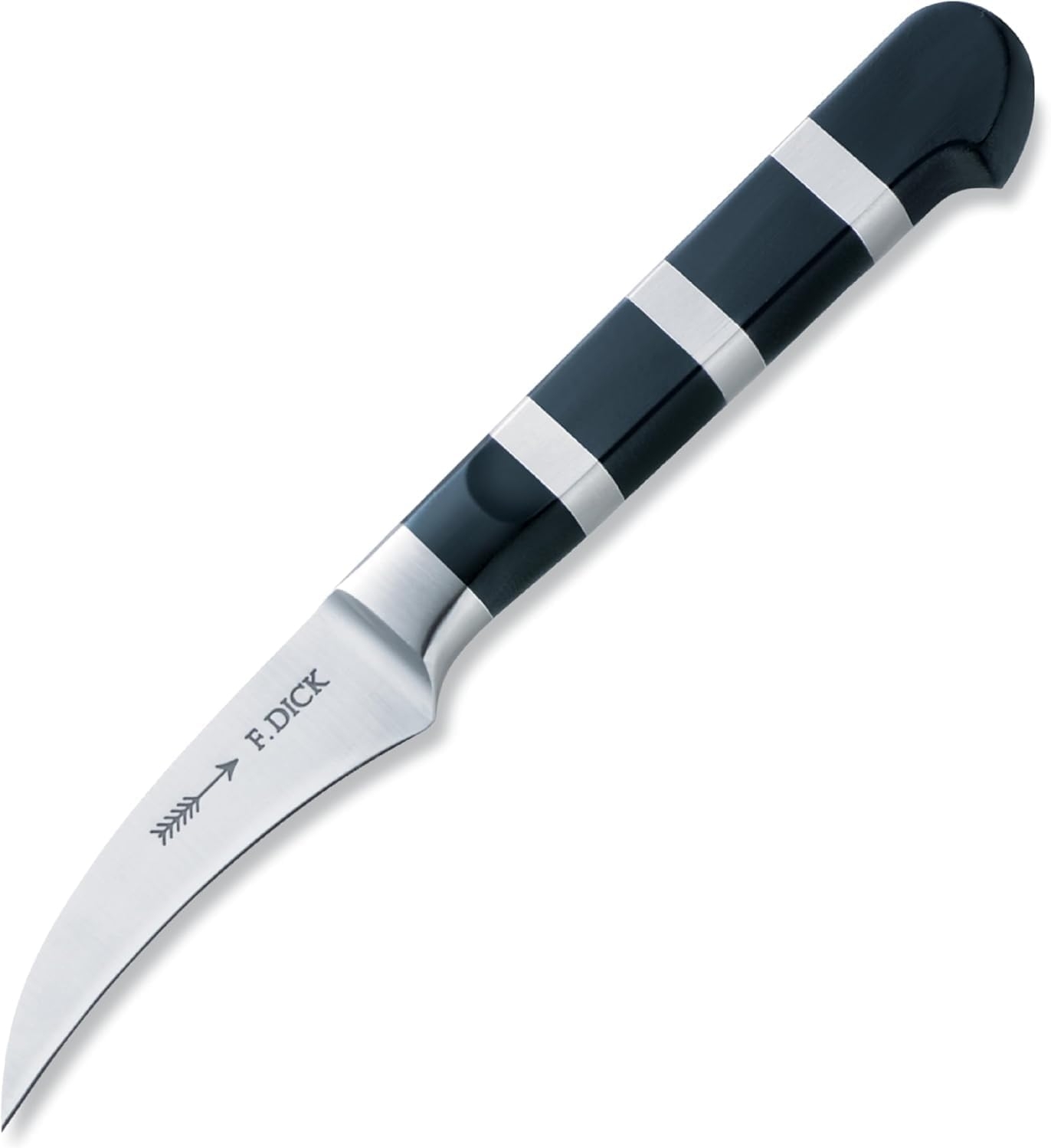 Das F. DICK Obstmesser "Serie 1905" vereint klassisches Design mit modernster Technologie. Die 7 cm lange Klinge aus hochwertigem deutschen Edelstahl XCrMoVMn bietet extreme Härte und Schärfe. Mit ihrer schlanken Form und optimalen Balance ermöglicht sie präzise Schnitte. Der Halbkropf-Fingerschutz erleichtert das Nachschärfen, während die hygienische Verbindung von Stahl und Kunststoff höchste Qualität garantiert. Ideal zum Schneiden, Schälen und Anrichten von Obst und Gemüse. **Highlights** - Klinge aus speziellem deutschen Edelstahl XCrMoVMn für extreme Härte und Schärfe - Optimale Balance für präzise Schnitte - Halbkropf-Fingerschutz für einfaches Nachschärfen - Hygienische Verbindung von Stahl und Kunststoff - Geschwungene Klinge für zügiges und effektives Arbeiten **Produkteigenschaften** - Klingenlänge: 7 cm - Hohe Schnitthaltigkeit durch deutschen High-End-Chromstahl "X Cr Mo V Mn" - Zweifacher Abzug und Polieren für absolute Schärfe - Lasergeprüfte Schneidengeometrie - Unverwechselbare Stahlringe