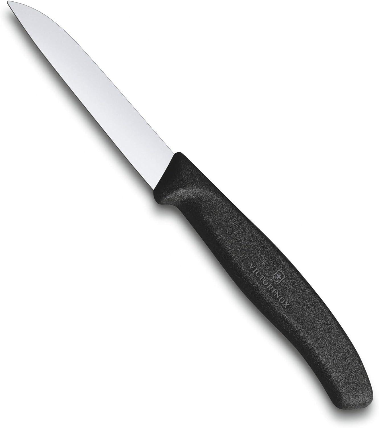 Victorinox Gemüsemesser Swiss Classic. Material: Edelstahl. Kunststoff. Länge: ca. 8 cm (Klinge). ca. 19 cm (gesamt). Farbe: schwarz. Mittelspitze Klinge. Klingentyp: gerader Schliff. Spülmaschinengeeignet.