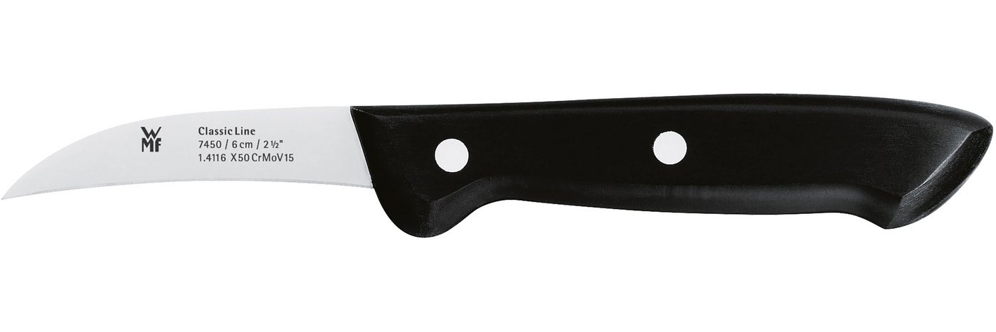 Das WMF Schälmesser 6 cm Classic Line ist ein unverzichtbares Küchenwerkzeug, das mit seiner schnabelförmigen Klinge mühelos Obst und Gemüse mit dünnen Schalen schält. Hergestellt aus rostfreiem und säurebeständigem Spezialklingenstahl, bietet es hohe Schärfe und Langlebigkeit. Der ergonomisch geformte Griff aus hochwertigem Kunststoff sorgt für eine angenehme Handhabung. Mit einer Gesamtlänge von 16 cm und einer Klingenlänge von 6 cm ist es ideal für den täglichen Gebrauch in der Küche. **Highlights** - Schnabelförmige Klinge für müheloses Schälen von Obst und Gemüse mit dünnen Schalen - Gehärteter Spezialklingenstahl für hohe Schärfe und Robustheit - Ergonomisch geformter Griff für angenehme Handhabung - Fugenlose Verarbeitung für einfache Reinigung und hohe Hygiene - Entwickelt in Deutschland **Produkteigenschaften** - Material: Klinge aus rostfreiem und säurebeständigem Spezialklingenstahl, Griff aus hochwertigem Kunststoff - Länge: 16 cm, Klingenlänge: 6 cm - Handwäsche empfohlen **Lieferumfang** - 1x WMF Schälmesser 16 cm Classic Line