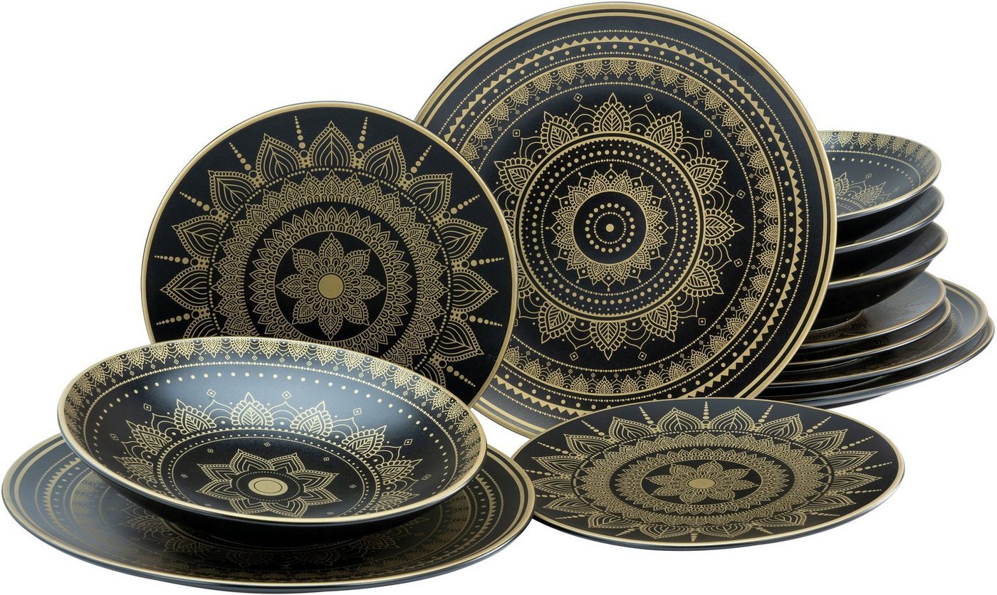 in Geschirr: Geschirr SetsCreaTable 23588 Tafelservice Mandala für 4 PersonenSteinzeug, schwarz/gold (1 Set, 12-teilig)