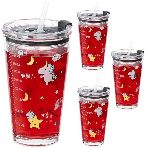 Das 4er Set Kindergläser mit bezauberndem Einhorn-Motiv ist ideal für kleine Abenteurer. Jedes Glas hat eine Kapazität von 450 ml und ist mit einem Deckel sowie einem Strohhalm ausgestattet, was sie perfekt für Gartenpartys oder Picknicks macht. Die Gläser sind spülmaschinenfest und mikrowellengeeignet (ohne Deckel und Strohhalm). **Highlights** - Niedliches Einhorn-Motiv für Kinder - Deckel mit Strohhalmöffnung und separater Trinköffnung - Spülmaschinenfest für einfache Reinigung - Messskala für Füllmenge - Mikrowellengeeignet ohne Deckel und Strohhalm **Produkteigenschaften** - Material: Glas, Kunststoff (ABS), Silikon - Farbe: Transparent, Weiß, Gelb - Maße (HxBxT): ca. 15,5 x 9 x 9,5 cm - Volumen: je ca. 450 ml - Temperaturbeständigkeit: -20 bis 100 °C - Max. Temperaturunterschied: 38 °C **Lieferumfang** - 4x Getränkeglas - 4x Deckel - 4x Strohhalm - Dekoartikel sind im Lieferumfang nicht enthalten