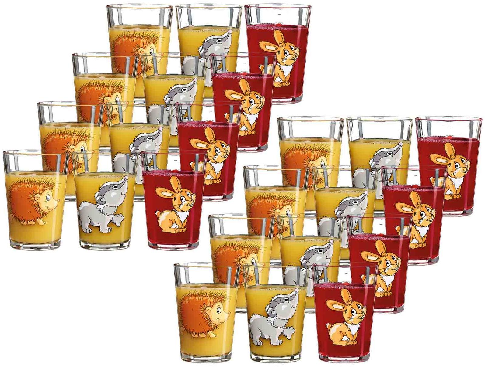 Die Ritzenhoff & Breker WALDTIERE Kinderbecher sind das perfekte Set für kleine Tierliebhaber. Mit 24 Kindergläsern, die niedliche Motive von Igeln, Dachsen und Hasen zeigen, bringen sie Freude in den Alltag. Jedes Glas hat einen Durchmesser von ca. 7 cm und eine Höhe von ca. 10 cm, mit einem Fassungsvermögen von ca. 205 ml. Die Gläser sind spülmaschinengeeignet und somit besonders pflegeleicht. **Highlights** - Set mit 24 Kindergläsern - Niedliche Motive von Igeln, Dachsen und Hasen - Ideal für kleine Tierliebhaber - Spülmaschinengeeignet - Perfekt für den täglichen Gebrauch **Produkteigenschaften** - Durchmesser: ca. 7 cm - Höhe: ca. 10 cm - Fassungsvermögen: ca. 205 ml - Material: Glas - Spülmaschinengeeignet **Lieferumfang** - 24x Trinkglas