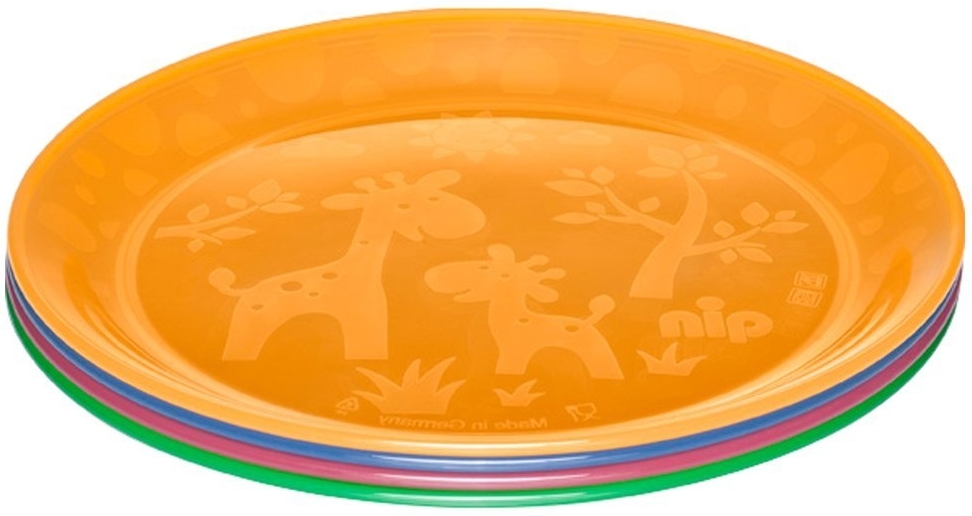 NIP Kinderteller im 4er Pack bieten eine ideale Lösung für das Essen von Kleinkindern. Hergestellt aus langlebigem, BPA-freiem Kunststoff, sind die Teller robust und halten auch unsanften Landungen stand. Mit einem Durchmesser von 19 cm sind sie leicht stapelbar und platzsparend. Die Teller sind spülmaschinen- und mikrowellengeeignet und überzeugen durch ein niedliches Giraffenmotiv in vier leuchtenden Farben. **Highlights** - Hergestellt aus langlebigem, BPA-freiem Kunststoff - Spülmaschinen- und mikrowellengeeignet - Leichte, stapelbare Form für platzsparende Aufbewahrung - Niedliches Giraffenmotiv in vier leuchtenden Farben - Geeignet für Kleinkinder ab 4 Monaten **Produkteigenschaften** - Durchmesser: 19 cm - 4 Teller im Set - Robuste Verarbeitung für unsanfte Landungen **Lieferumfang** - 4 x Kinderteller - Ausschluss von Besteck und weiteren Zubehörteilen