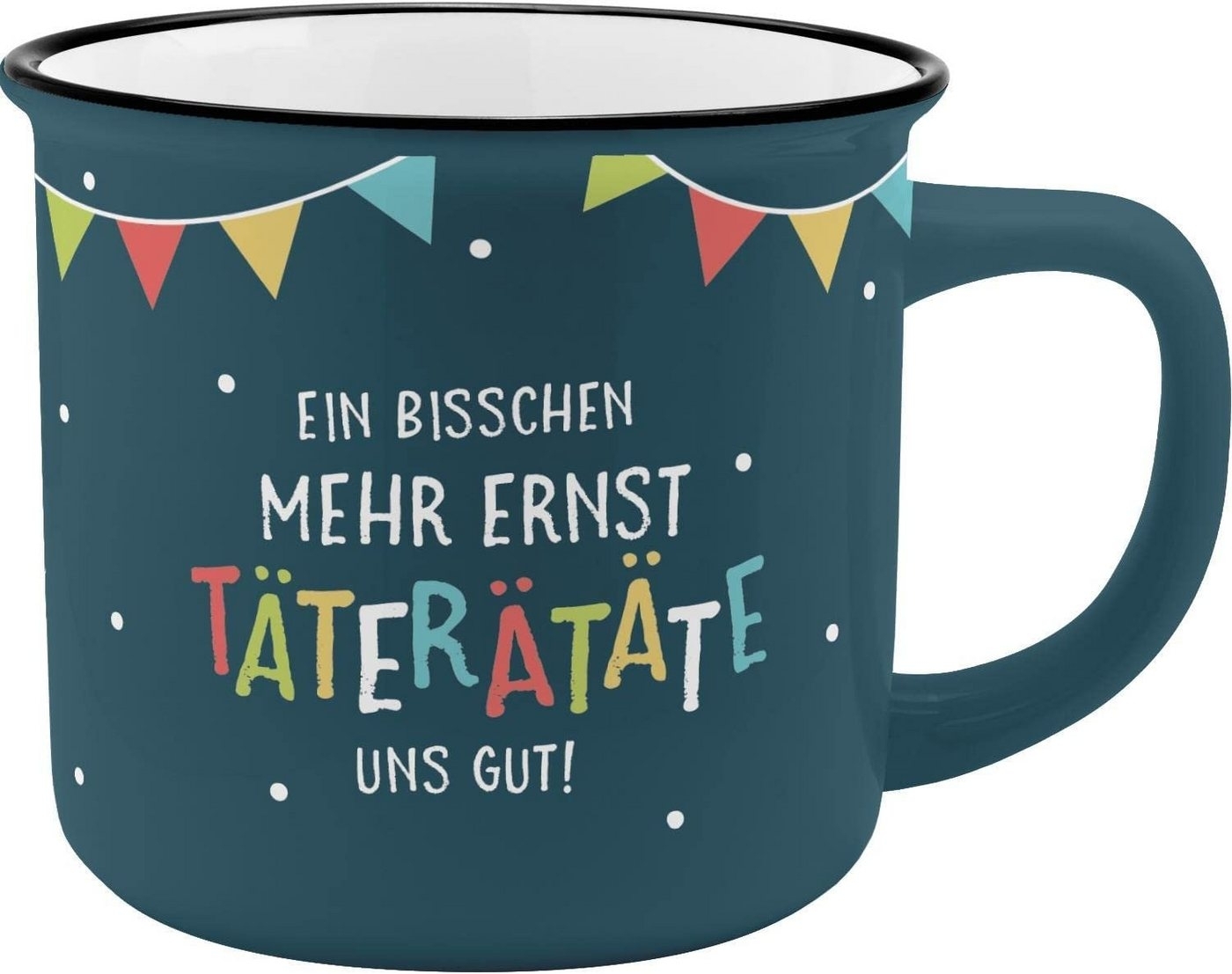 Nostalgische Tasse im Vintage-Look mit einem charmanten Spruch „Ein bisschen mehr Ernst“. Diese Kaffeetasse aus hochwertigem New Bone China Porzellan hat ein Volumen von 35 cl und ist in einer dekorativen Geschenk-Banderole verpackt. Das ansprechende Retro-Design in Emaille-Optik bringt frischen Wind in jede Kaffeerunde und ins Büro. Ideal als Geschenk für Familie, Freunde und Kollegen. **Highlights** - Nostalgischer Vintage-Look: Angesagtes Retro-Design in Emaille-Optik - Tasse mit Spruch: „Ein bisschen mehr Ernst“ für eine persönliche Note - Voll im Trend: Aktuelle Designs und Materialien für Zuhause und Büro - Ideales Geschenk: Für Familie, Freunde, Kollegen und als kleine Überraschung - Hergestellt in Deutschland: Von der Marke GRUSS & CO seit 1997 **Produkteigenschaften** - Material: New Bone China Porzellan - Volumen: 35 cl - Höhe: 8,4 cm - Durchmesser: 9 cm - Verpackung: Geschenk-Banderole - Hersteller: SHEEPWORLD AG - Ursprungsland: Deutschland **Lieferumfang** - 1x Tasse Becher Kaffeetasse "Ernst" - Exklusive Geschenk-Banderole - Ausschluss von weiteren Zubehörteilen
