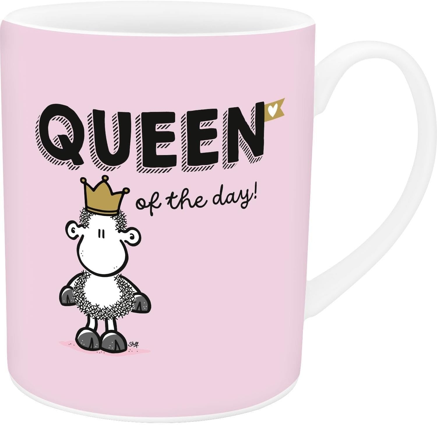 XL-Tasse QUEEN: Diese große Sheepworld Jumbo-Tasse bringt Farbe und Freude in Ihren Alltag. Mit einem Volumen von 60 cl und einem Durchmesser von 9,5 cm eignet sie sich perfekt für Kaffee oder Tee. Der liebevolle Spruch „Queen of the day“ sorgt für ein Lächeln und macht sie zur idealen Geschenkidee für jeden Anlass. Hergestellt aus hochwertigem Porzellan und verpackt in einer ansprechenden Geschenk-Banderole. **Highlights** - Volumen: 60 cl, ideal für große Getränke - Durchmesser: 9,5 cm, für eine angenehme Handhabung - Höhe: 11,5 cm, bietet ausreichend Platz für Ihren Lieblingsdrink - Buntes Sheepworld Motivdekor, sorgt für gute Laune - Perfekte Geschenkidee für verschiedene Anlässe **Produkteigenschaften** - Material: Porzellan - Füllmenge: geeignet für rund 50 cl - Verpackung: passend gestaltete Geschenk-Banderole - Marke: Sheepworld, bekannt für liebevolle Designs seit 1997 **Lieferumfang** - 1 x XL-Tasse QUEEN - Geschenk-Banderole (exklusive weiterer Produkte)