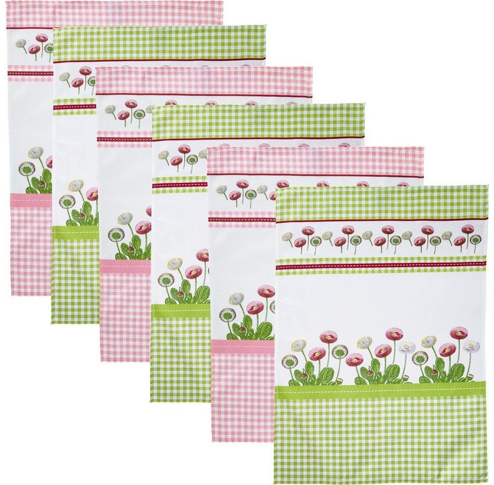 Erwin Müller Geschirrtuch im 6er-Pack aus 100 % Baumwolle. Die fröhlichen Karos und Gänseblümchen sorgen für eine angenehme Atmosphäre in Ihrer Küche. Die strapazierfähige und saugstarke Qualität garantiert eine hohe Funktionalität. Jedes Geschirrtuch ist mit einer praktischen Schlaufe zum Aufhängen ausgestattet und erreicht nach mehrmaligem Waschen seine volle Saugfähigkeit. **Highlights** - 6er-Pack für vielseitige Verwendung - Fröhliches Karo-Design mit Blumenmotiven - Strapazierfähige und saugstarke Baumwollqualität - Praktische Schlaufe zum einfachen Aufhängen - Volle Saugfähigkeit nach mehrmaligem Waschen **Produkteigenschaften** - Material: 100 % Baumwolle (BW) - Waschhinweise: Waschen bei 60 °C, nicht bleichen, Trocknen bei niedriger Temperatur, heiß bügeln, keine chemische Reinigung **Lieferumfang** - 6 Geschirrtücher im Karo Design mit Blumenmotiven