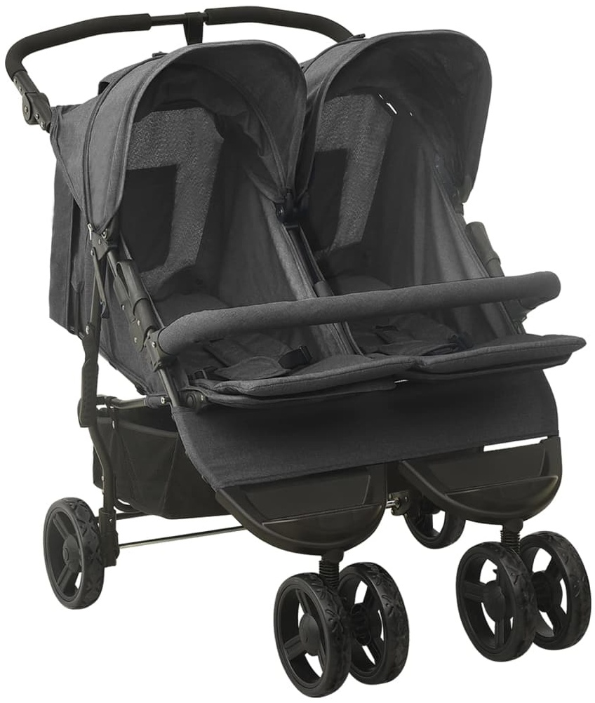 Mit diesem praktischen Zwillingswagen können Sie Ihre Kinder zum Spaziergang im Park, zum Einkaufen usw. mitnehmen. Der Kinderwagen für 2 Kinder verfügt über einen Stahlrahmen, der ihn robust und langlebig macht. Die Rückenlehne und die Fußstütze sind in mehreren Positionen verstellbar und bieten so hohen Komfort. Das runde Verdeck schützt Ihre Kinder vor direkter Sonneneinstrahlung. Darüber hinaus bietet die vordere Stoßstange optimale Sicherheit und verhindert das Herausfallen. Der mitgelieferte praktische Korb eignet sich ideal zur Aufbewahrung von Babyartikeln. Dieser Zwillingsbuggy lässt sich auch zusammenklappen, um eine einfache Lagerung und Transport zu gewährleisten. Farbe: Anthrazit Material: Stahl, Leinenstoff Abmessungen (aufgeklappt): 99 x 78 x 103 cm (B x T x H)Abmessungen (zusammengeklappt): 80 x 79 x 45 cm (B x T x H)Zusammenklappbar Verstellbarer Lenker Mit rundem Verdeck Mit Frontstoßstange Rückenlehne in mehrere Positionen verstellbar Verstellbare Fußstütze Mit Korb Max Belastbarkeit: 15 kg Zusammenbau erforderlich: Ja