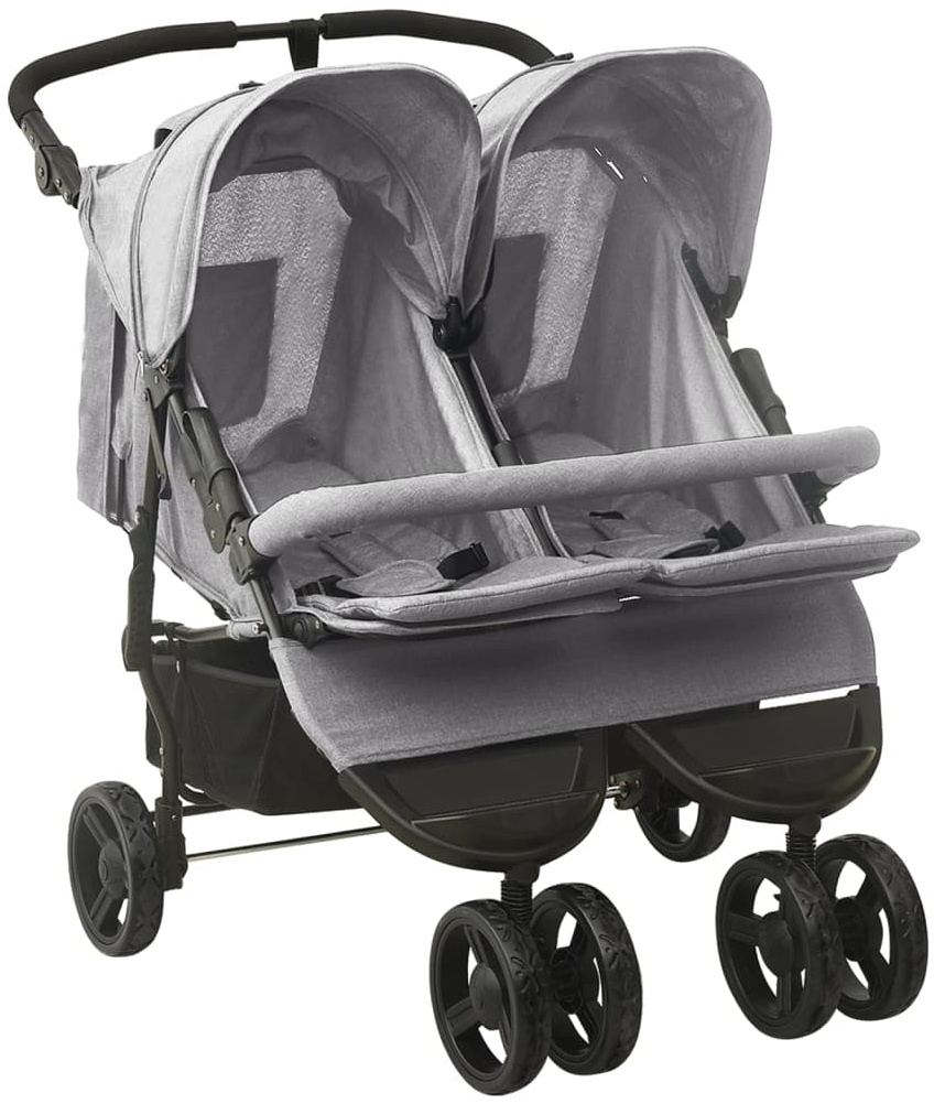 Mit diesem praktischen Zwillingswagen können Sie Ihre Kinder zum Spaziergang im Park, zum Einkaufen usw. mitnehmen. Der Kinderwagen für 2 Kinder verfügt über einen Stahlrahmen, der ihn robust und langlebig macht. Die Rückenlehne und die Fußstütze sind in mehreren Positionen verstellbar und bieten so hohen Komfort. Das runde Verdeck schützt Ihre Kinder vor direkter Sonneneinstrahlung. Darüber hinaus bietet die vordere Stoßstange optimale Sicherheit und verhindert das Herausfallen. Der mitgelieferte praktische Korb eignet sich ideal zur Aufbewahrung von Babyartikeln. Dieser Zwillingsbuggy lässt sich auch zusammenklappen, um eine einfache Lagerung und Transport zu gewährleisten. Farbe: Hellgrau Material: Stahl, Leinenstoff Abmessungen (aufgeklappt): 99 x 78 x 103 cm (B x T x H)Abmessungen (zusammengeklappt): 80 x 79 x 45 cm (B x T x H)Zusammenklappbar Verstellbarer Lenker Mit rundem Verdeck Mit Frontstoßstange Rückenlehne in mehrere Positionen verstellbar Verstellbare Fußstütze Mit Korb Max Belastbarkeit: 15 kg Zusammenbau erforderlich: Ja