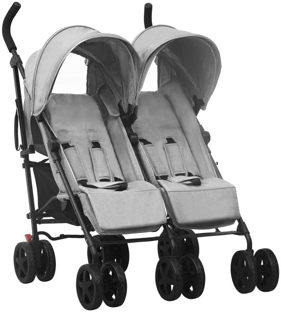 Dieser Geschwisterwagen erleichter das Elternsein und eignet sich perfekt für Abenteuer im Freien wie Spaziergänge im Park, Einkaufen mit der Familie oder Auslandsreisen. Die Rückenlehne dieses Kinderwagens ist 4-fach verstellbar, sodass Ihr Baby stets die bequemste Position einnehmen kann. Die Fußstütze lässt sich auch verstellen. Das klappbare Verdeck schützt die Kinder vor starker Sonne und UV-Strahlen. Der mitgelieferte Korb bietet Platz für Sachen wie Windeln, Decken oder Spielzeuge. Dieser Zwillingskinderwagen lässt sich mit nur einer Hand durch eine sanfte Bewegung zusammen- und ausklappen, was den Transport erheblich erleichtert. Farbe: Hellgrau Material: Stahl, Leinenstoff Gesamtabmessungen: 76,5 x 79 x 105 cm (B x T x H)Größe (zusammengeklappt): 66 x 100 cm (B x H)Mit 12 Rädern Zusammenklappbar Mit Verdeck Verstellbare Fußstütze Einhand-Klappsystem Mit Korb und Traggürtel4-fach verstellbare Rückenlehne (über einen Knopf)Zusammenbau erforderlich: Ja