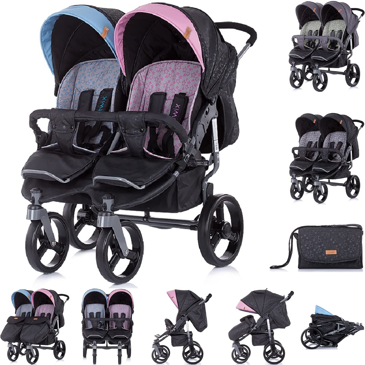Der Geschwister-Kinderwagen Twix von Chipolino mit schwenkbaren Vorderrädern bietet wendigen Fahrspaß. Kinder gleichen oder ähnlichen Alters genießen nebeneinander Spazierfahrten und Ausflüge im Geschwisterwagen. Unabhängig voneinander können die Rückenlehnen und die Beinauflagen eingestellt werden. Der Zwillingswagen ist schnell und einfach zusammengeklappt, zusätzlich können alle vier Räder per Knopfdruck demontiert werden. Mit im Lieferumfang enthalten sind zwei Fußsäcke mit Magnetverschluss und eine Wickeltasche. Besonderheiten Artikel Chipolino Geschwisterkinderwagen Twix bis maximal 44 kg klappbar Wickeltasche Vorderräder sind 360° schwenk- oder feststellbar einfach zusammenklappbar mit automatischer Verriegelung unabhängig voneinander 3-fach verstellbare Rückenlehnen 5-Punkt-Sicherheitsgurt mit Polsterung abnehmbare, gepolsterte Frontbügel Hinterräder mit Feststellbremse Sonnendächer mit Sichtfenster Taschen mit Reißverschluss an der Rückseite der Sonnendächer 2 Fußsäcke mit Magnetverschluss großer Ablagekorb alle 4 Räder sind leicht und schnell demontiert Wickeltasche im Lieferumfang enthalten Altersempfehlung: ab Geburt maximale Traglast: 44 kg (2 x 22 kg) Produktvideo vorhanden Weitere Informationen zum Artikel Chipolino Zwillingskinderwagen Twix bis maximal 44 kg klappbar Wickeltasche Gewicht des Kinderwagens mit Rädern: 17,5 kg Gewicht ohne Räder: 13 kg Produktmaße: L 72 x B 82 x H 100 cm Produktmaße zusammengeklappt: L 78 x B 79 x H 40 cm Sitzabmessung je Sitz: H 79 x B 30 cm Kartongröße: 78 x 78 x 32 cm Versandgewicht: 19 kg