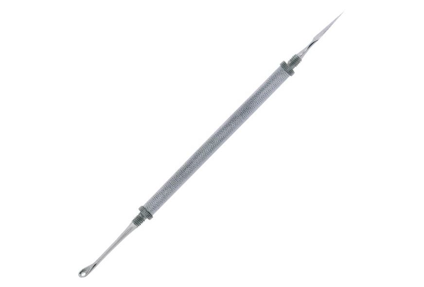 - Mit dem spitzen Ende kann die Haut zuerst aufgestochen werden, bevor die Ablagerungen mit der Schlinge herausgelöst werden.