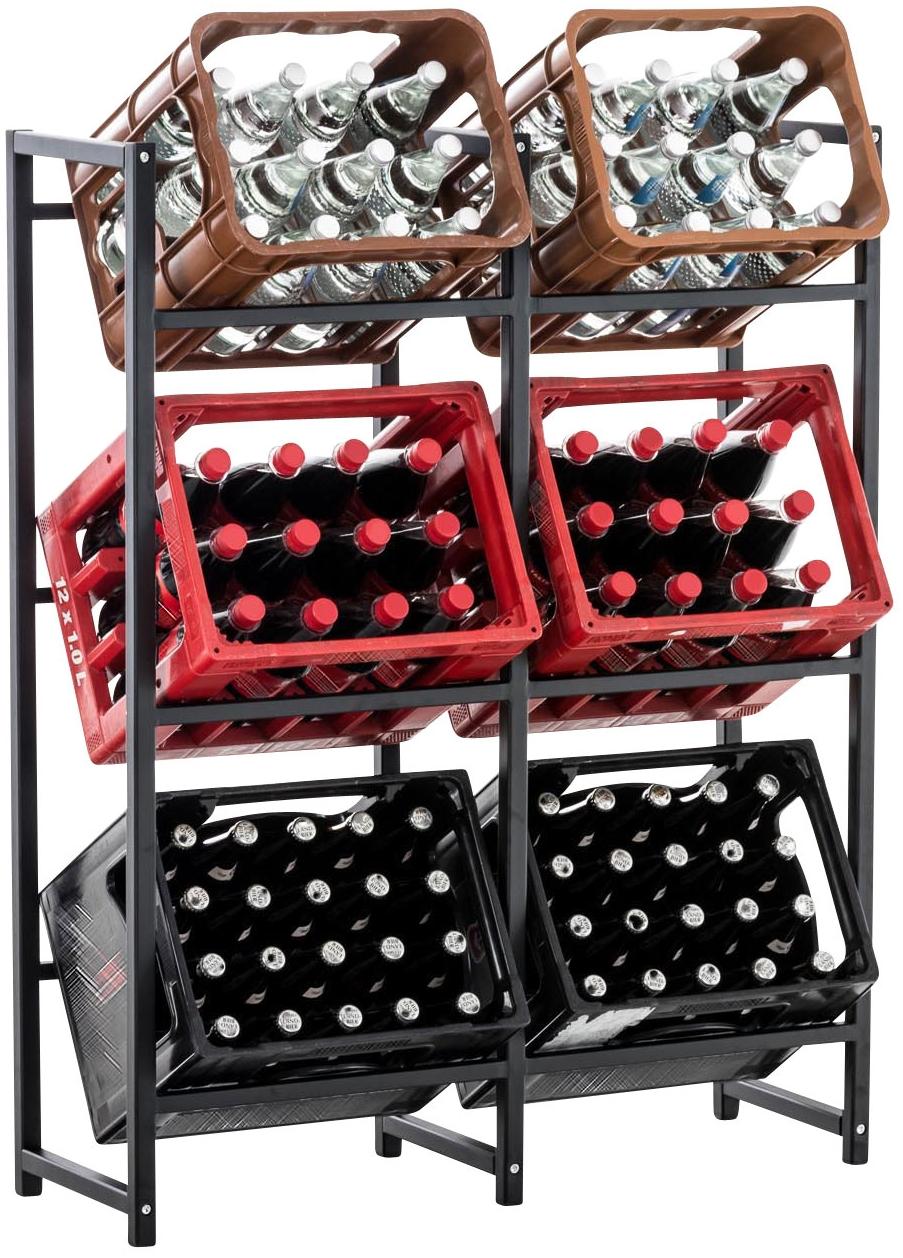 Der CLP Getränkekistenständer Lennert in schwarz X-Large vereint Funktionalität und ansprechendes Design. Durch die schräge Positionierung der Kisten wird eine bequeme Entnahme und Einsortierung der Flaschen ermöglicht. Der Ständer ist vielseitig einsetzbar und eignet sich nicht nur für Getränkekisten, sondern auch für Holzkisten. Mit seiner eleganten Optik fügt er sich harmonisch in jeden Wohnbereich ein. **Highlights** - Schräg positionierte Kisten für bequeme Entnahme - Hochwertige Optik, ideal für den Wohnbereich - Vielseitig einsetzbar für verschiedene Behälter - Robuste Konstruktion für mehrere Kisten **Produkteigenschaften** - Gesamtbreite: 91 cm (4er und 6er), 47 cm (2er und 3er) - Gesamttiefe: 31 cm - Gesamthöhe: 75 cm (2er und 4er), 116 cm (3er), 112 cm (6er) - Maximale Kistenlänge: 41 cm - Kistenanzahl: 2 Stück (2er), 3 Stück (3er), 4 Stück (4er), 6 Stück (6er)