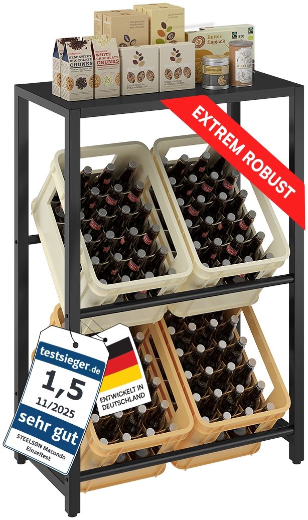 Das Getränkekistenregal 'Macondo' von STEELSØN vereint funktionale Eleganz mit robuster Stahlkonstruktion. Sein zeitloses Design passt sich nahtlos jeder Umgebung an und sorgt für eine geordnete und platzsparende Lagerung von Getränkekisten. **Hochwertige Materialien für maximale Stabilität** Gefertigt aus verzinktem Stahl mit einer Rahmenstärke von 25 mm, ist das Getränkekistenregal 'Macondo' extrem stabil und langlebig. Die stoß- und kratzfeste Oberfläche garantiert eine zuverlässige Nutzung – ideal für den Einsatz in Küche, Keller oder Büro. **Platzsparendes Design mit praktischen Funktionen** Das Regal Platz für **bis zu 4 klassische Getränkekisten**. Die Ablageflächen sind ergonomisch gestaltet, sodass das Entnehmen und Aufstellen der Kisten mühelos gelingt. Höhenverstellbare Füße sorgen für einen sicheren Stand, auch auf unebenen Böden. **Beeindruckende Belastbarkeit** Jede Kistenablage ist mit **100 kg** belastbar, während der Regalboden zusätzlich bis zu **20 kg** tragen kann. Dies macht das Getränkekistenregal zu einer zuverlässigen Lösung für Ihre Getränkevorräte. **Mehr als nur ein Regal** Das Getränkekistenregal 'Macondo' ist mehr als eine einfache Aufbewahrungslösung. Es optimiert Ihren Stauraum, hält Ihre Getränkekisten jederzeit griffbereit und bringt Ordnung und Struktur in Ihren Wohn- oder Arbeitsbereich. **Produktdetails:** - Platz für 4 Kisten - Maße: 75 x 115 x 33 cm - Max. Belastbarkeit pro Getränkekistenablage: 100 kg - Max. Belastbarkeit Regalboden: 20 kg - Material: Stahl (Stahl-Epoxid-Pulverbeschichtung) - Inkl. höhenverstellbaren Füßen - Einfache und schnelle Montage