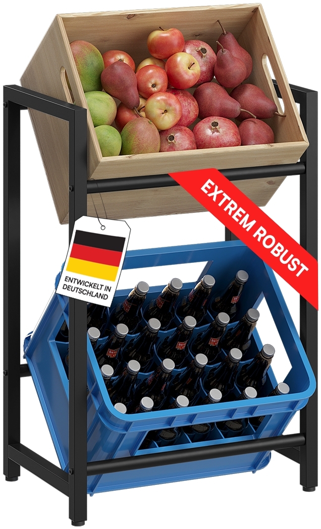 Das Getränkekistenregal ‚Mystra‘ von STEELSØN verbindet Funktionalität mit robustem Design aus hochwertigem Stahl. Es bietet eine praktische und platzsparende Lösung für die Aufbewahrung von Getränkekisten und fügt sich durch sein zeitloses Erscheinungsbild harmonisch in jeden Raum ein. **Robust und langlebig** Hergestellt aus verzinktem Stahl mit einer stabilen Rahmenstärke von 25 mm, ist das Regal ‚Mystra‘ extrem widerstandsfähig und langlebig. Die stoß- und kratzfeste Oberfläche sorgt für eine zuverlässige Nutzung, egal ob in der Küche, im Keller oder im Büro. **Platzsparendes Design** Das Regal bietet Platz für bis zu 2 klassische Getränkekisten. Die ergonomisch gestalteten Ablageflächen ermöglichen ein müheloses Entnehmen und Aufstellen der Kisten. Höhenverstellbare Füße garantieren dabei einen sicheren Stand, selbst auf unebenen Böden. **Hohe Belastbarkeit** Jede Kistenablage ist mit bis zu 100 kg belastbar, was das Regal zu einer zuverlässigen Lösung für Ihre Getränkevorräte macht. **Einfache Montage und durchdachte Konstruktion** Das Getränkeregal ‚Mystra‘ lässt sich schnell und unkompliziert montieren. Es bringt Ordnung in Ihren Stauraum und hält Ihre Getränkekisten jederzeit griffbereit. **Produktdetails** - **Platz für:** 2 Kisten - **Maße:** 75 x 50 x 33 cm - **Max. Belastbarkeit pro Kistenablage:** 100 kg - **Material:** Stahl mit Epoxid-Pulverbeschichtung - **Extras:** Höhenverstellbare Füße - **Montage:** Einfach und schnell