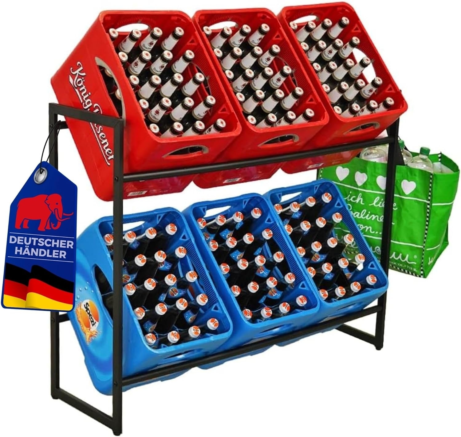 | Lieferumfang | 1x Getränkekistenregal, 2x Haken, 2x Auflageträger (ohne Getränkekisten) |