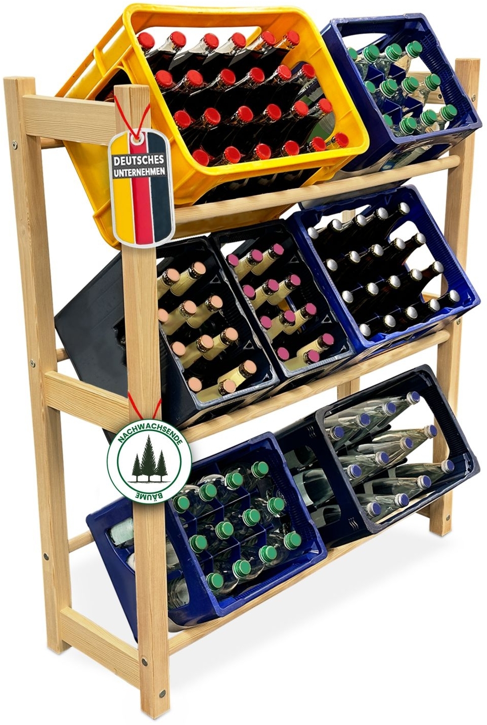 - Das Getränkekistenregal THORE aus Holz bietet Platz für die Lagerung von 3 oder 6 Getränkekisten sowie Obst- und Gemüsekisten.