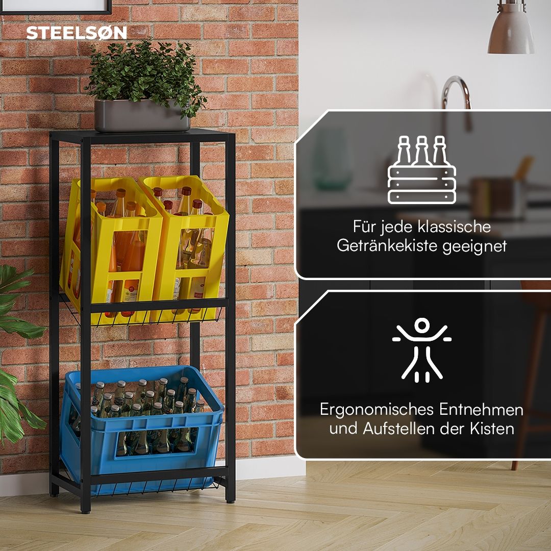 | Name | STEELSØN 'Montune' Getränkekistenregal, Metall schwarz, 115x50x33 cm, Aufbewahrung für 2 Kisten mit Gitterhalterung und Ablage |