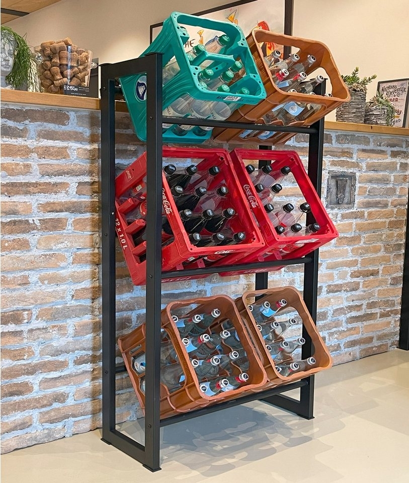 Sehr stabiles Getränkekistenregal zur Lagerung von 6 Sprudelkisten übereinander. Details: * Breite/Tiefe: 104x30cm. * Höhe: 90cm * Rahmengestell: 45x23mm * Material: Stahl, Matt Schwarz pulverbeschichtet * Die QUICK STAR Regale haben mit 50cm Lagenabstand genau den nötigen Abstand, um die Kisten sehr komfortabel ein- und auszulagern. * Getränketurm mit Platz für 6 Getränkekisten. Der Bodenabstand ist für Staubsauger zugänglich. Geringer Abstand zur Rückwand mit durchdachter Konstruktion. * Gummiabschlüsse schonen den Boden und schützen vor Kratzern auf Parkett oder Laminat. **Die Ware wird zerlegt zur Selbstmontage geliefert.**