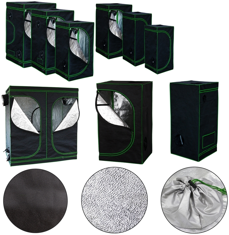 Das Indoor Gewächshaus bietet Ihnen mit den Maßen 100 x 100 x 200 cm optimale Bedingungen für die Pflanzenzucht in Ihren eigenen vier Wänden. Hergestellt aus robustem Oxford 600D Material in Schwarz und einer hochreflektierenden silbernen Innenfolie, sorgt es für effektives Wachstum Ihrer Pflanzen. Die praktische Ausstattung umfasst einen großen Fronteingang, doppelte Zugänge für Belüftungssysteme sowie einen wasserfesten, herausnehmbaren Bodeneinsatz. Ideal für Erde und Hydroponik, ist es auch als begehbarer Kleiderschrank nutzbar. **Highlights** - Optimales Pflanzenwachstum im Innenbereich - Großzügige Pflanzfläche für eine Vielzahl von Pflanzen - Robuste Konstruktion aus hochwertigen Materialien - Leichter Zugang und intelligentes Belüftungssystem - Stilvolles schwarz-grünes Design **Produkteigenschaften** - Maße: 100 x 100 x 200 cm - Farbe: Schwarz / Grün - Material außen: Oxford 600D, schwarz - Material innen: hochreflektierende Folie, silber - Material Stangen: Metall, weiß - Material Eckverbinder: Kunststoff, grün - 99,9 % lichtundurchlässig - 95 % Lichtreflektion im Innenraum - Inkl. großer Fronteingang mit Schnapphaken - 2-Wege-Zipper - Doppelwandige Zugänge mit Zugband - Inkl. wasserfester, herausnehmbarer Bodeneinsatz - Vorbereitete Öffnungen für Kohlefilter - Belüftungsklappe mit Netzeinsatz gegen Schädlinge - Inkl. 2 Schlaufen zur Aufhängung der Lüftung - Werkzeugfreier Aufbau **Lieferumfang** - 1 x Indoor Gewächshaus - Ausschluss von Zubehör wie LED Grow-Lampen und Hydrokultur-Systemen