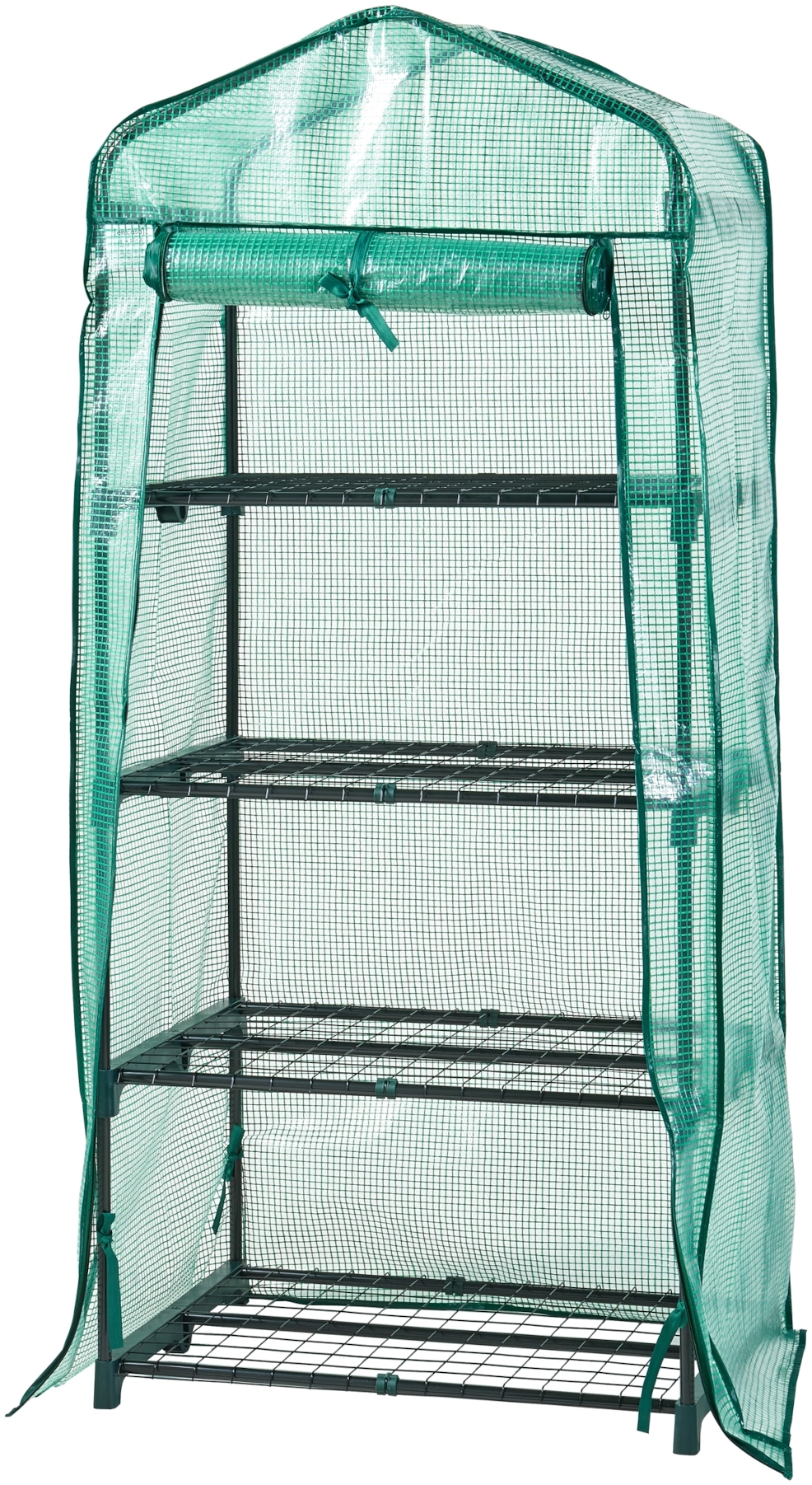 Das Gewächshaus Chaam ist ein vielseitiges Foliengewächshaus mit den Maßen 158 x 69 x 49 cm in der Farbe Grün. Es lässt sich dank des praktischen Stecksystems schnell und unkompliziert aufbauen. Mit vier Gitterablagen bietet es ausreichend Platz für Pflanzen, Gemüse und Kräuter. Die strapazierfähige Abdeckung aus Polyethylen schützt vor Regen, Sonne und unerwünschten Tieren, während die rollbare Tür mit Reißverschluss das Gießen und Lüften erleichtert. **Highlights** - Foliengewächshaus mit aufrollbarer Tür - Vier Gitterablagen für Pflanzen, Gemüse und Kräuter - Verhindert, dass Schädlinge und Vögel Ihre Pflanzen angreifen - Schützt Ihre Sprösslinge vor Kälte, Wind und Wetter - Effektiver Regenablauf durch Spitzdach **Produkteigenschaften** - Maße (HxBxT): 158 x 69 x 49 cm - Material: Rahmen aus pulverbeschichtetem Stahl - Abdeckung: PE-Gitterfolie, 140 g/m² - Jede Ablage ist bis zu 15 kg belastbar - Schneller und einfacher Aufbau durch Stecksystem **Lieferumfang** - 1 x Foliengewächshaus - 4 x Gitterablage - 1 x Aufbauanleitung