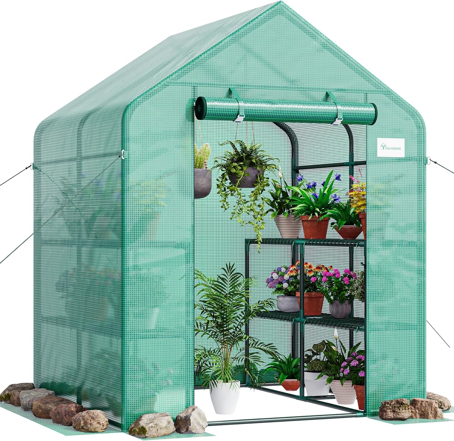 Das YITAHOME Gewächshaus XL bietet Ihnen mit seinen 3 Ebenen und 12 Regalen ausreichend Platz für Ihre Pflanzen. Die PE-Abdeckung schützt vor Wettereinflüssen und UV-Strahlung. Mit einer praktischen Reißverschlusstür haben Sie jederzeit Zugang zu Ihren Pflanzen. Das stabile Gestell sorgt für Sicherheit und Komfort beim Platzieren Ihrer Pflanzen. Ideal für den Innen- und Außenbereich, ermöglicht es Ihnen, Ihr grünes Leben überall zu verwirklichen. **Highlights** - 3 Ebenen mit 12 Regalen für optimalen Platz - Wetterfest und UV-beständig für besten Schutz - Reißverschlusstür für einfachen Zugang zu den Pflanzen - Stabiles, spritzlackiertes Gestell für Sicherheit - Ganzjährig verwendbar, drinnen und draußen **Produkteigenschaften** - Maße (HxBxT): 195 x 143 x 143 cm - Hergestellt aus hochwertigem PE-Gewebe - Inklusive Erdankern und Seilen für zusätzliche Stabilität - Einfache Montage und Demontage für flexiblen Einsatz - Geeignet für den Einsatz überall, wo Platz vorhanden ist