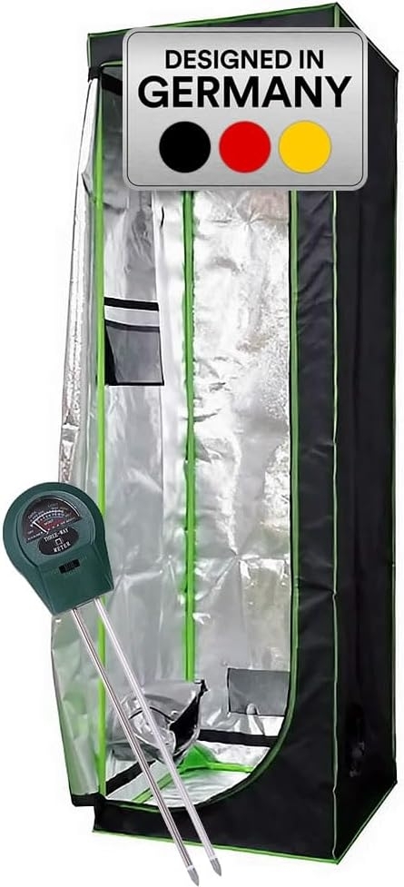 Das Indoor Gewächshaus bietet Ihnen mit den Abmessungen 60 x 60 x 220 cm (L x B x H) optimale Bedingungen für die Pflanzenzucht in Ihren eigenen vier Wänden. Hergestellt aus robustem Oxford 600D in Schwarz und einer hochreflektierenden silbernen Folie im Innenraum, sorgt es für 99,9 % Lichtundurchlässigkeit und 95 % Lichtreflektion. Die praktische Ausstattung umfasst einen großen Fronteingang, doppeltwandige Zugänge für Belüftungssysteme sowie einen wasserfesten, herausnehmbaren Bodeneinsatz. **Highlights** - 99,9 % lichtundurchlässig für optimale Wachstumsbedingungen - 95 % Lichtreflektion im Innenraum fördert effektives Pflanzenwachstum - Einfacher Zugang durch großen Fronteingang mit Schnapphaken - Werkzeugfreier Aufbau für unkomplizierte Montage - Inklusive GRATIS 3-in-1 Boden Feuchtigkeitsmessgerät für präzise Pflanzenpflege **Produkteigenschaften** - Maße: 60 x 60 x 220 cm (L x B x H) - Farbe: Schwarz / Grün - Material außen: Oxford 600D, schwarz - Material innen: hochreflektierende Folie, silber - Material Stangen: Metall, grün - Material Eckverbinder: Kunststoff, grün - Inkl. Belüftungsklappe mit Netzeinsatz gegen Schädlinge - Geeignet für Erde sowie hydroponische Aufzucht **Lieferumfang** - 1 x Indoor Gewächshaus in Schwarz / Grün - 1x3 in 1 Boden Feuchtigkeitsmessgerät