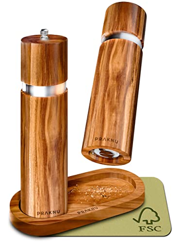 in GewürzmühlenSalz und Pfeffermühle aus Akazienholz mit Untersetzer - Nachhaltiges FSC® Holz - Langlebiges Keramikmahlwerk - Plastikfrei