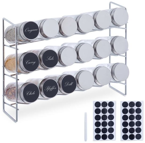 Mit diesem freistehenden Gewürzregal bringen Sie Ordnung in Ihre Küche. Auf drei Etagen finden bis zu 18 Gewürze und Kräuter Platz. Dank des offenen Designs sind die Gewürze jederzeit griffbereit. Jede Gewürzdose verfügt über zwei manuell einstellbare Streustufen, um Ihre Gerichte nach Belieben zu würzen. Zusätzlich können Sie die 36 mitgelieferten Blanko-Etiketten zur Beschriftung nutzen. **Highlights** - Freistehendes Design für mehr Ordnung in der Küche - Platz für bis zu 18 Gewürze und Kräuter - Zwei manuell einstellbare Streustufen für individuelles Würzen - 36 Blanko-Etiketten zur einfachen Beschriftung - Modernes Design, passend für jede Küche **Produkteigenschaften** - Gesamtmaße H x B x T: ca. 22 x 29 x 9,5 cm - Regal ohne Gläser H x B x T: ca. 22 x 29 x 7 cm - Gesamtgewicht: ca. 2,1 kg - Material: Glas, Edelstahl, Eisen - Farbe: Silber, Transparent - Maße je Glas H x D: ca. 9x4 cm - Füllmenge je Glas: ca. 80 ml - Gewicht pro Glas: ca. 100 g **Lieferumfang** - 1x Gewürzregal - 18x Gewürzglas (ungefüllt) - 36 Etiketten inkl. weißem Stift - Dekoartikel sind im Lieferumfang nicht enthalten