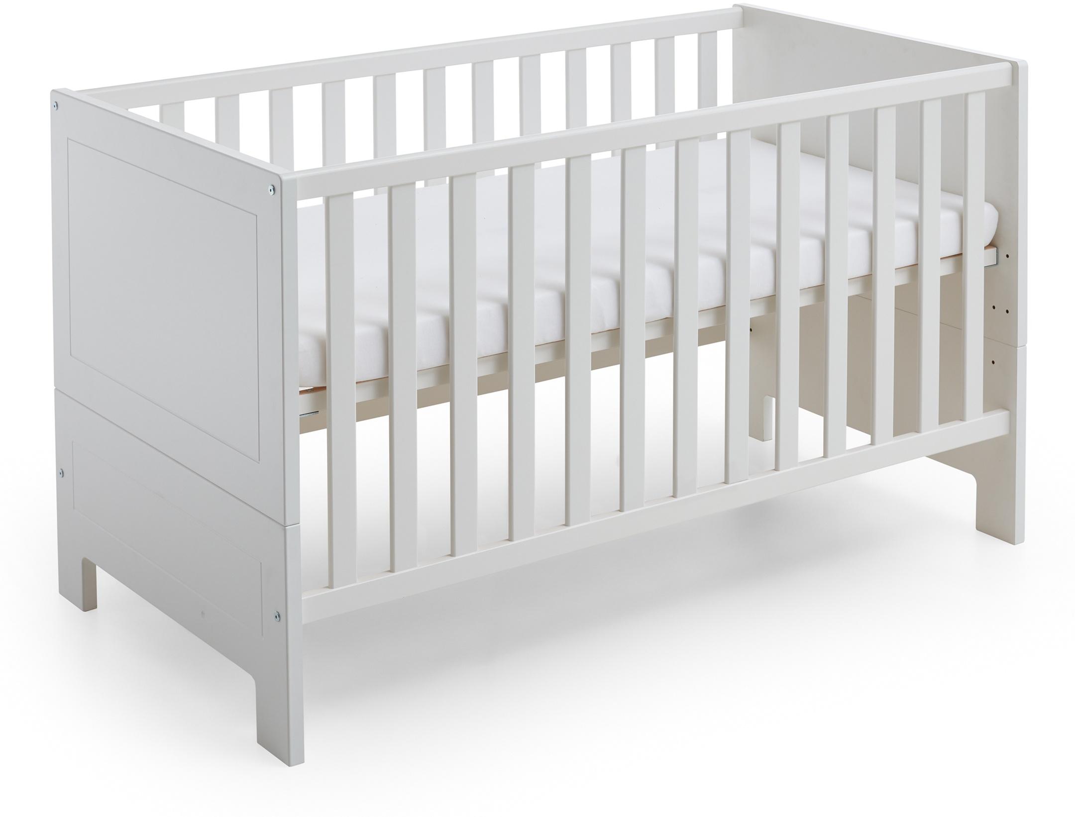 Das Kinderbett 'Thilo' von arthur berndt besticht mit den weißen hochwertigen MDF-Fronten, in welche wir ganz dezente Kassetten eingefräst haben. Diese verleihen dem Babybett eine ganz besondere Struktur. Mit 4-fach verstellbarem Lattenrost passt sich die Liegefläche in der gewünschten Höhe an. Mit den optional bestellbaren Umbauseiten erweitern Sie es ganz einfach zu einem Juniorbett und erfreuen sich so an einer längeren Nutzungsdauer. Zusätzlicher Stauraum kann durch den ebenfalls separat bestellbaren Bettschubkasten geschaffen werden. Liegefläche: 70x140 cm Inklusive 4-fach höhenverstellbarem Lattenrost Kopf- und Fußteil geteilt Gitterseiten mit Flachstäben Ein Seitengitter mit 3 Schlupfsprossen (ermöglicht dem Baby das problemlose Herauskrabbeln aus dem Bett) Maximale Belastung: 25 kg Erweiterbar zum Juniorbett durch die optional bestellbaren Umbauseiten (siehe Artikel-Nr. 61033634) Hochwertige MDF-Fronten mit Kassettenfräsung Pflegeleichte Melaminoberfläche (kann einfach mit einem feuchten Tuch gereinigt werden) Material: Holzwerkstoff / MDF (Fronten) bzw. Massivholz (Gitterseiten und Lattenrost), melaminbeschichtet Farbe Korpus: Weiß Farbe Seitengitter / Lattenrost: Weiß Gefertigt nach DIN EN 716-1 Aufstellmaße (B/H/T): 143/86/78 cm Hinweis Maßangaben: Alle Angaben sind ca. -Maße Lieferumfang und Montage: Selbstmontage mit Aufbauanleitung Inkl. Montagematerial (Beschlagbeutel) Anzahl der Packstücke: 2 Matratze / Dekoration nicht im Lieferumfang enthalten