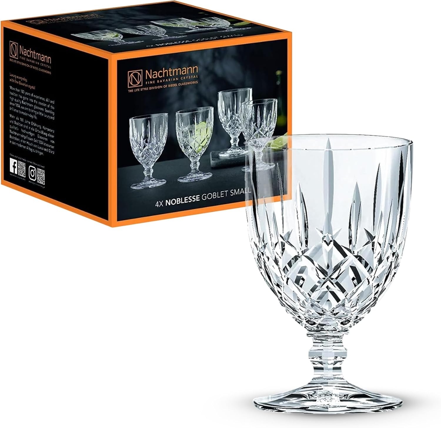 Nachtmann Glas Noblesse 230 ml 4er Set. Diese eleganten Kelchgläser aus feinstem Kristallglas vereinen Ästhetik und Funktionalität. Mit einer Füllmenge von ca. 230 ml und einer Höhe von 12,6 cm sind sie ideal für Wasser, Saft oder Cocktails. Die Gläser sind spülmaschinenfest und zeichnen sich durch ihre erhöhte Bruchfestigkeit aus. Ein luxuriöses Must-Have für jede Hausbar. **Highlights** - Made in Germany - Brillant und klar - Erhöhte Bruchfestigkeit - Spülmaschinenfest - Zeitloses Schliff-Design **Produkteigenschaften** - Material: Kristallglas - Maße (H x Ø): 12,6x7,9 cm - Füllmenge: 230 ml - Gewicht: 980 g - Verarbeitung reinster Zutaten und spezieller Rohstoffe **Lieferumfang** - 4 x Nachtmann Noblesse Kelchglas klein - Hersteller-Artikelnummer: 102086