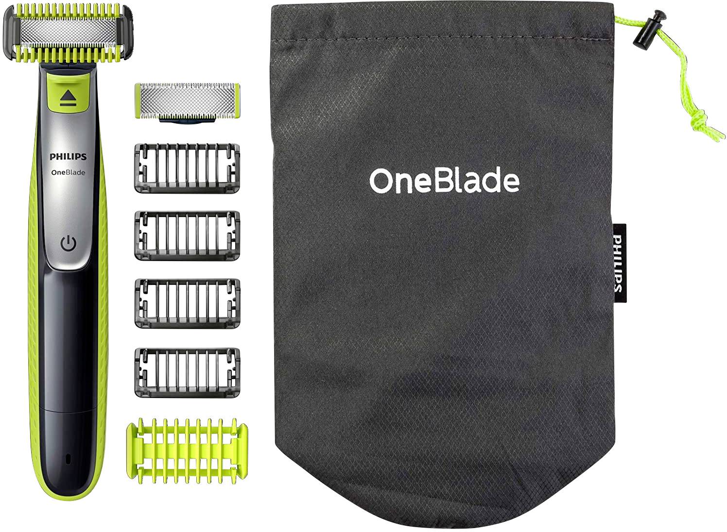 | Lieferumfang | OneBlade Handstück + 2x Klingen + 4x Trimmaufsätze für das Gesicht + 1x Trimmaufsatz für den Körper + 1x Hautschutzaufsatz + Reisebeutel |