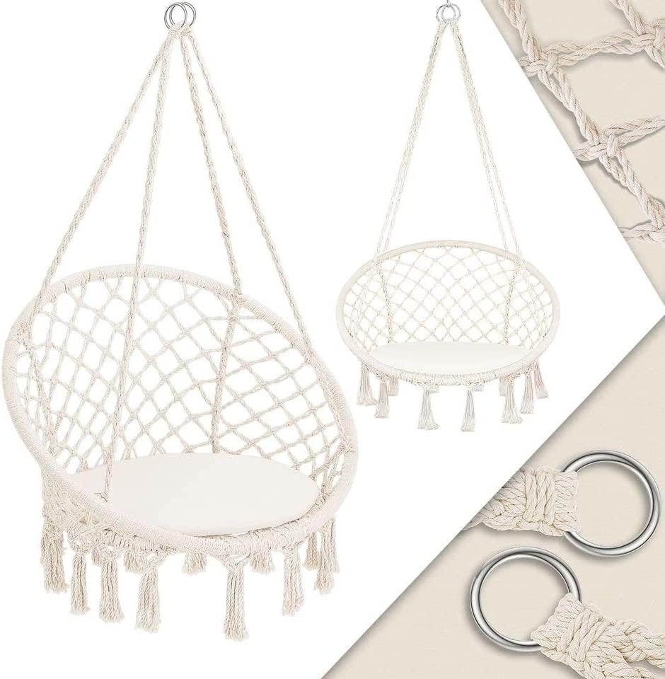 | Name | KESSER Hängesessel 150kg mit 2 Stahlringe Sitzpolster geflochten Fransen Hängestuhl Hängekorb Schaukelkorb Garten Indoor wetterfest , wasserabweisend Beige |