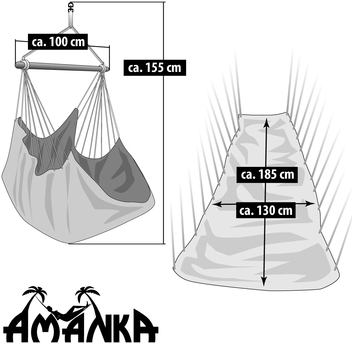 Der XXL Hängesessel von AMANKA bietet mit seinen großzügigen Maßen von ca. 185x130 cm und einer Belastbarkeit von bis zu 150 kg Platz für entspannte Stunden. Hergestellt aus 320 g/m² schwerer Baumwolle und einem robusten Holz-Spreitzstab, garantiert er sowohl Komfort als auch Stabilität. Der 360° drehbare Metall-Swivel sorgt für eine flexible Nutzung, während der Abrutschschutz zusätzlichen Halt bietet. Ideal für Garten, Balkon oder Wohnzimmer. **Highlights** - Unfassbar bequem – ideal zum Lesen, Schlafen und Träumen - Gut für den Rücken – entlastet die Wirbelsäule und schont die Gelenke - Belastbar bis 150 kg – Platz für bis zu 2 Personen - Liegeschaukel mit Abrutschschutz – sichere Verbindung mit dem Holzstab - Für Gestell, Baum & Decke – vielseitig einsetzbar **Produkteigenschaften** - Gesamtmaße (Tuch): ca. 185x130 cm - Gesamtmaße (Holzstab): ca. 100x4 (Ø) cm - Gesamthöhe vom kompletten Hängestuhl: ca. 155 cm - Drehschutz: 1 x Swivel - Material (Tuch): 320 g/m² 100% Baumwolle - Material (Stab): Massivholz **Lieferumfang** - 1 x kompletter Hängesitz in der gewählten Farbe (1 x Sitzfläche, 1 x Spreitzstab Holz, 1 x Drehwirbel für die Aufhängung)