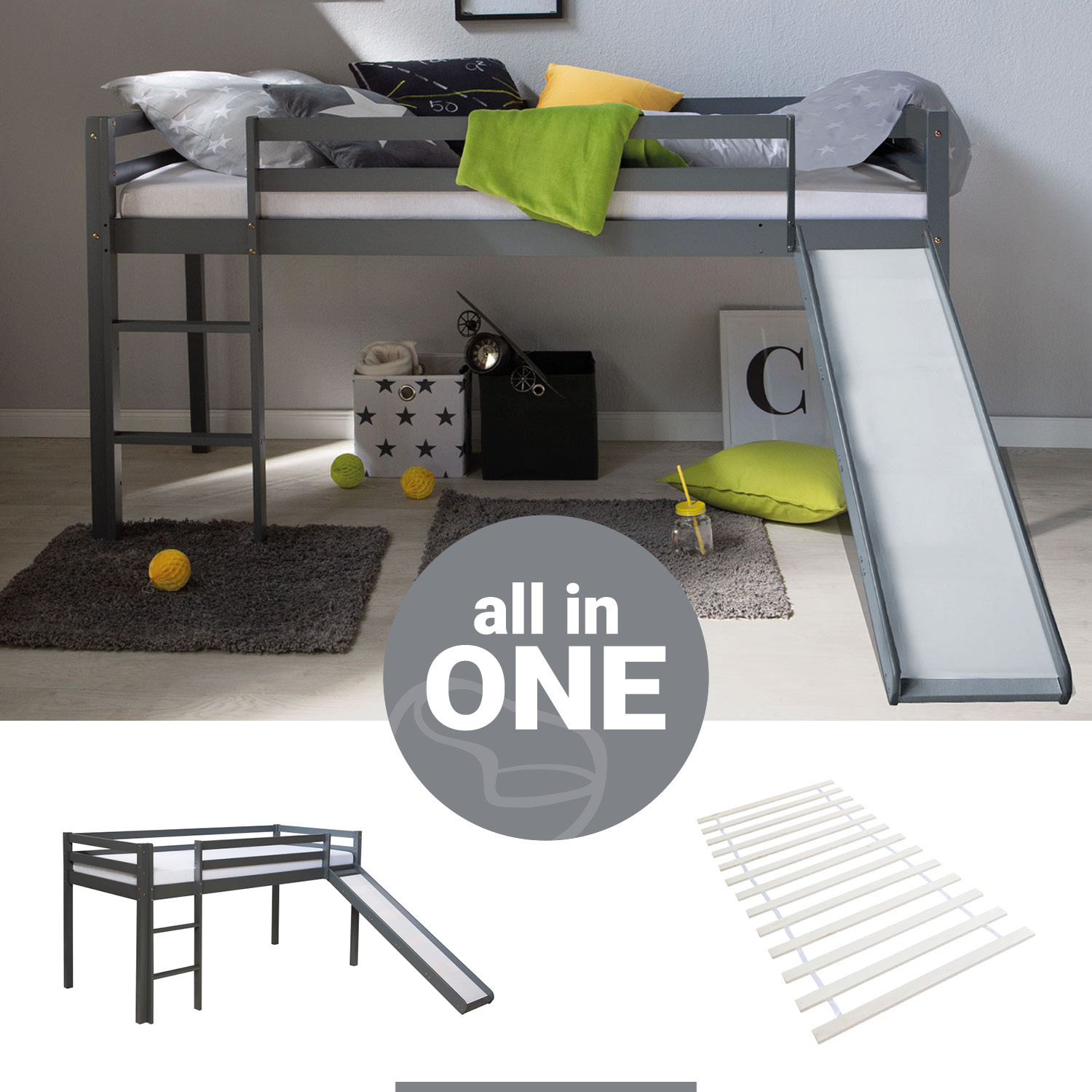 Hochbetten bieten nicht nur mehr Platz im Kinderzimmer, sondern sind auch Teil von Abenteuern und Fantasiespielen für Kinder. Unter dem stabilen Bett entsteht durch eine Höhe von 75 cm viel Stauraum für Sitzgruppen oder Spielzeug. Die Liegefläche von unserem Rutschenbett beträgt 90x200 cm. Ein klassisches Rolllattenrost, welches Ihren ruhigen und erholsamen Schlaf unterstützt, ist inklusive. Je nach Raumkonstellation können Leiter und Rutsche wechselseitig montiert werden. Produktdetails: • Bettgestell mit Liegefläche: 90x200 cm • inklusive Rolllattenrost aus 13 Holzlatten • Leiter und Rutsche wechselseitig montierbar • mit Sicherheitsumrandung (Absturzsicherung) • abgerundete Kanten und Pfosten Maße: • Liegefläche: 90x200 cm • Maße Bett: (Bx Hx T) 207 x 110 x 97 cm • Tiefe mit Rutsche insgesamt: 123 cm • Breite von Rutsche: 36,5 cm • Spielhöhe unter dem Bett: 75 cm • Höhe Absturzsicherung: 26 cm • Einlegetiefe Matratze: 4 cm • Pfostenstärke: 5 cm • Maße Lattenrost (Bx Hx T): 90 x 1,3 x 6 cm • Abstand der einzelnen Leisten: 10 cm Material & Farbe: • Bett aus massivem Kiefernholz gefertigt • grau lackiert • Pflegehinweis: mit einem feuchten Tuch abwischen • Lattenrost aus Kiefernholz, naturbelassen • Oberfläche gehobelt • Doppelseitig mit Gurtbändern versehen Lieferdetails: • Kinderbett mit Leiter, Rutsche und Lattenrost • Nicht inklusive: Matratze und Dekoration • Produkt wird zerlegt geliefert und muss montiert werden • Aufbauanleitung und Zubehör zur Montage befinden sich im Paket