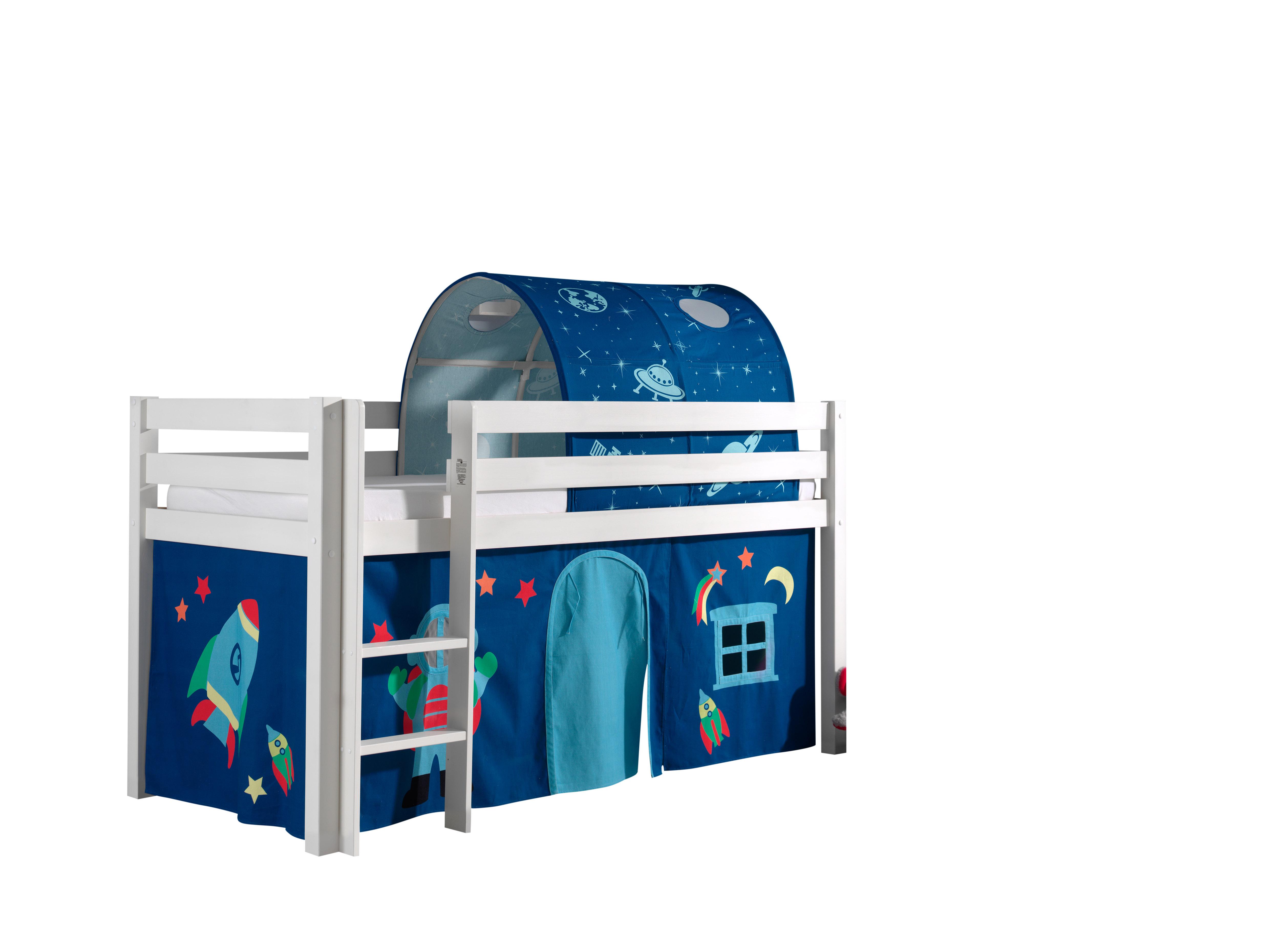 in HalbhochbettenSpielbett Pino mit Textilset Vorhang und Tunnel "Astro"Kiefer massiv weiß lackiert