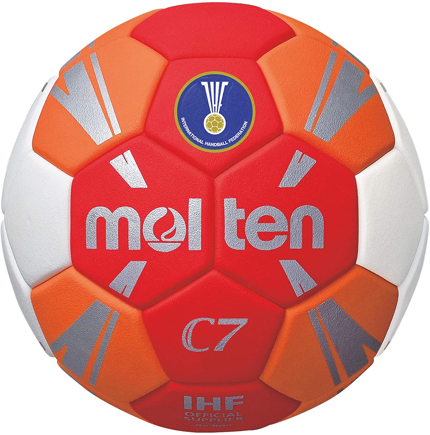 - Der Molten H1C3500-RO ist ein Handball in den Farben rot, orange, weiß und silber.