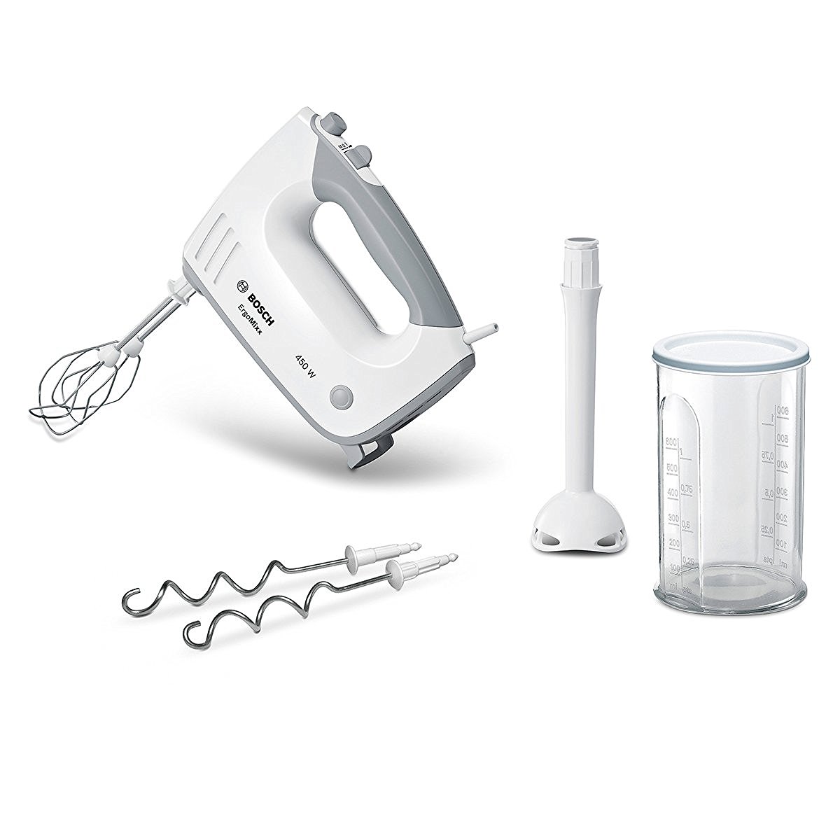 Bosch MFQ36440 ErgoMixx Handrührer (450 W, spülmaschinengeeignet, ergonomische Form, leise, geringes Gewicht, hitzebeständiger Mixfuß, Mixbecher) weiß