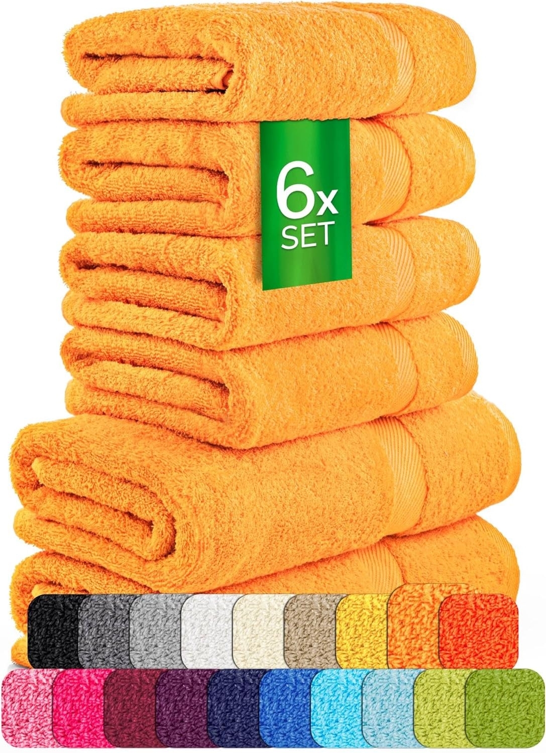 Die 6-teiligen Dusch- und Handtuchsets Carli Safran bestehen aus hochwertiger Frottierware aus 100% Baumwolle. Mit einem Flächengewicht von 500 g/m² bieten sie hervorragende Saugfähigkeit und eine weiche, flauschige Haptik. Die Handtücher sind bei 60°C waschbar und trocknergeeignet, was die Pflege unkompliziert macht. Die klassische Bordüre verleiht den Handtüchern ein modernes und stilvolles Design. **Highlights** - 100% Baumwolle nach Öko-Tex Standard 100 für höchste Qualität - Flächengewicht von 500 g/m² sorgt für eine gute Saugfähigkeit - Klassische Bordüre für ein modernes und schickes Design - Waschbar bei 60°C und trocknergeeignet für einfache Pflege - Langlebige Verarbeitung für den kommerziellen Einsatz **Produkteigenschaften** - Erhältliche Größen: - 15 x 21 cm Waschhandschuh - 30 x 30 cm Seiftuch - 30 x 50 cm Gästetuch - 50 x 100 cm Handtuch - 70 x 140 cm Duschtuch - 100 x 140 cm Badetuch - 80 x 200 cm Saunatuch - Super solides gewebtes Ringgarn - Farbstabile Farben in verschiedenen Tönen **Lieferumfang** - 6-teiliges Handtuch-Set - Waschhandschuh - Seiftuch - Gästetuch - Handtuch - Duschtuch