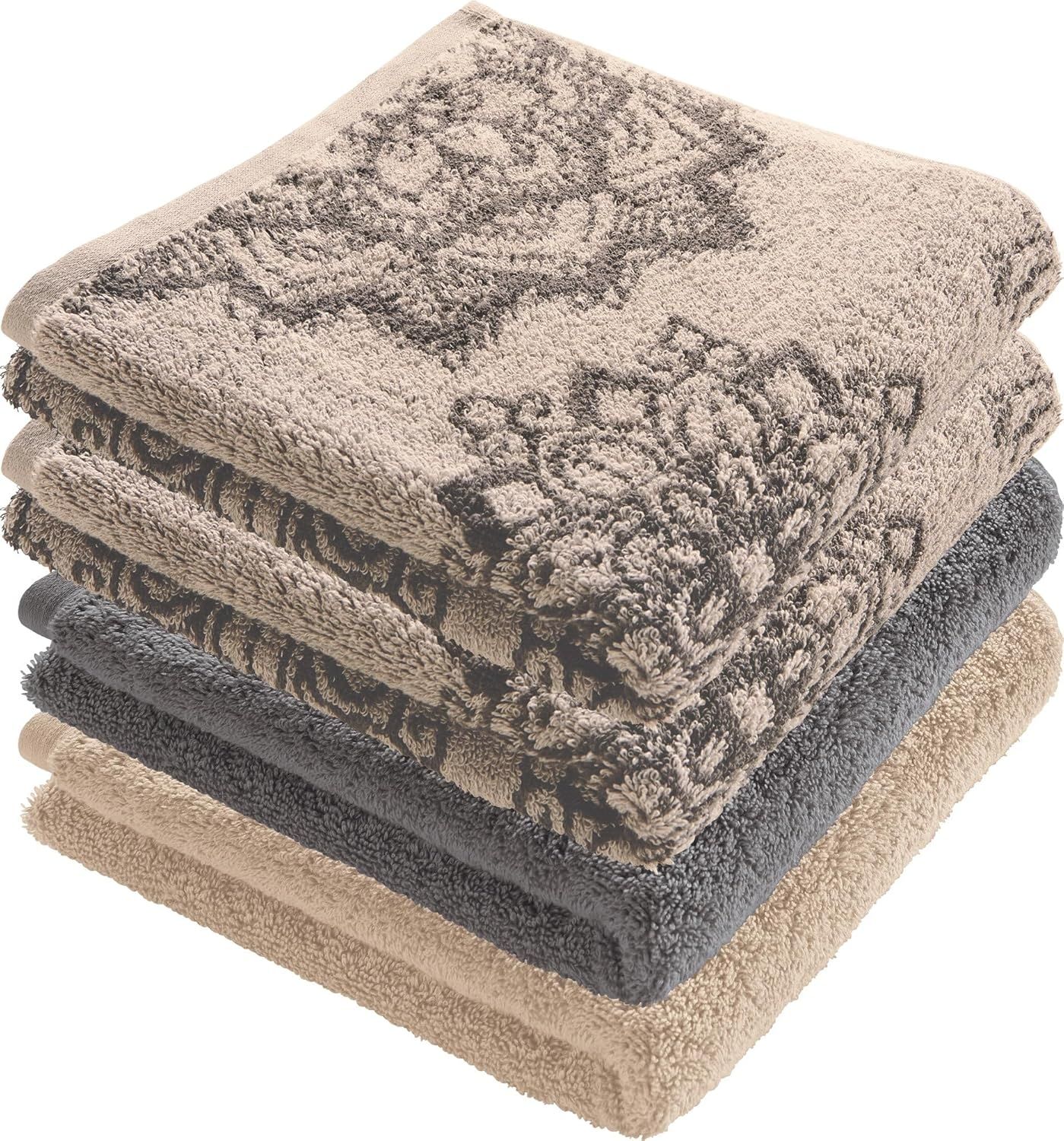 | Lieferumfang | 2x Handtuch (mit Mandala-Motiv), 1x Handtuch (einfarbig hell), 1x Handtuch (einfarbig dunkel) |