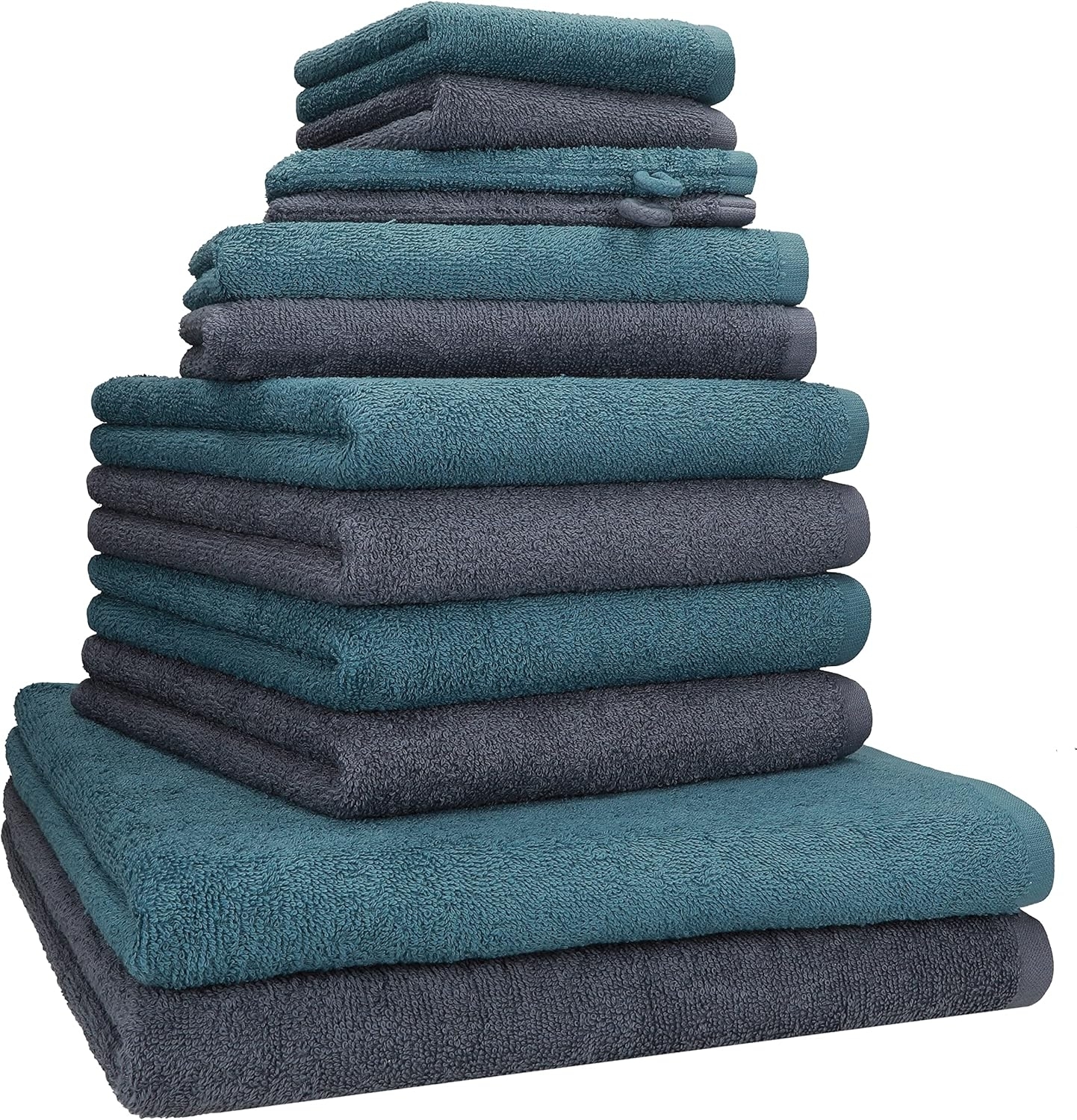 Hochwertiges 12-teiliges Handtuch Set BERLIN in den Farben dunkelgrau und taubenblau. Hergestellt aus 100% Baumwolle mit einer Grammatur von 360 g/m², bietet es flauschige Weichheit und hohe Saugfähigkeit. Das Set umfasst 2 Liegetücher (70 x 140 cm), 4 Handtücher (50 x 100 cm), 2 Gästetücher (30 x 50 cm), 2 Seiftücher (30 x 30 cm) und 2 Waschhandschuhe (16 x 21 cm). Pflegeleicht und waschbar bis 60 °C, ist es zudem trocknergeeignet. **Highlights** - 100% Baumwolle für hohe Saugfähigkeit und Weichheit - Pflegeleicht, waschbar bis 60 °C und trocknergeeignet - Zeitloses Design, passend für jedes Bad - Hochwertige Qualität mit 360 g/m² - Komplettes Set für alle Bedürfnisse im Bad **Produkteigenschaften** - 2 Liegetücher: 70 x 140 cm - 4 Handtücher: 50 x 100 cm - 2 Gästetücher: 30 x 50 cm - 2 Seiftücher: 30 x 30 cm - 2 Waschhandschuhe: 16 x 21 cm - Extrem strapazierfähig und langlebig **Lieferumfang** - 2 Liegetücher - 4 Handtücher - 2 Gästetücher - 2 Seiftücher - 2 Waschhandschuhe