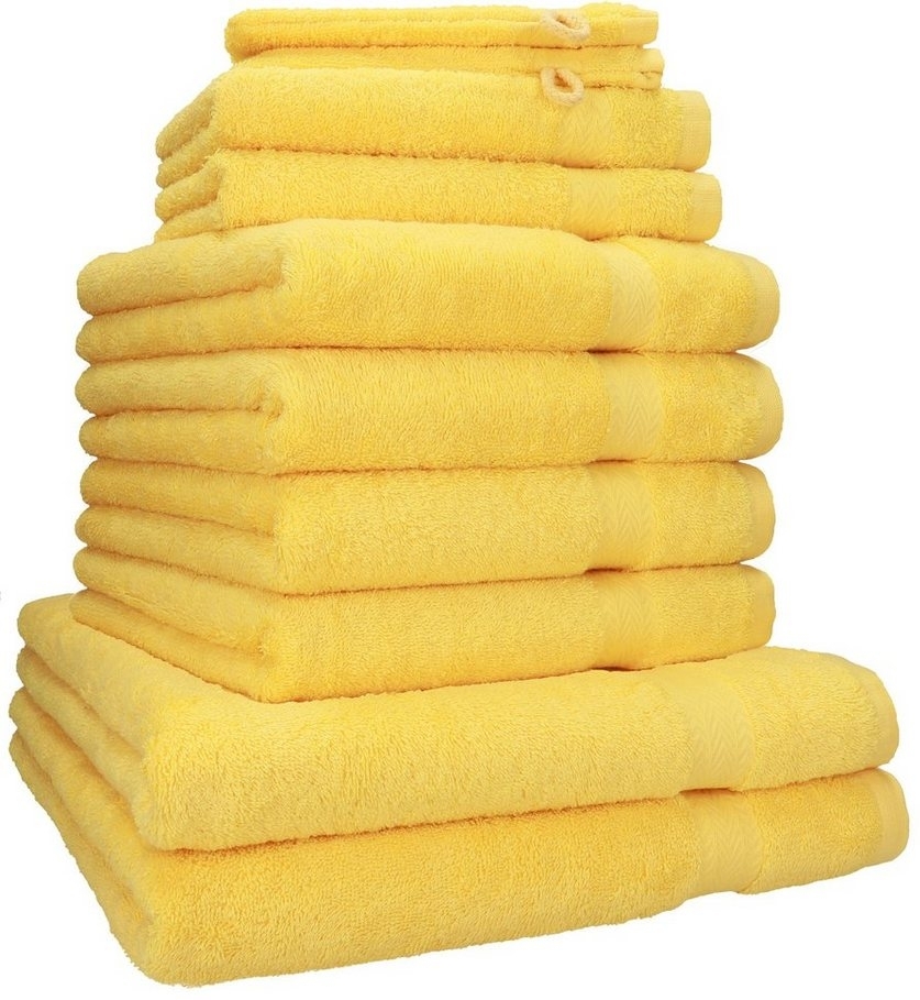 Das Betz Handtuch Set besteht aus 10 Teilen und ist aus 100 % Baumwolle gefertigt. Mit einem Flächengewicht von 470 g/m² bietet es eine hohe Saugfähigkeit und ein angenehmes Hautgefühl. Die unifarbene Optik in Gelb sorgt für eine frische Note in Ihrem Badezimmer. Das Set umfasst 2 Badetücher, 4 Handtücher, 2 Gästetücher und 2 Waschhandschuhe und ist bei 60 °C maschinenwaschbar sowie trocknergeeignet. **Highlights** - 100 % Baumwolle für hohe Saugfähigkeit und Komfort - Flächengewicht von 470 g/m² für optimale Qualität - Unifarbene Optik in Gelb für frisches Design - Pflegeleicht: Maschinenwäsche bis 60 °C - Trocknergeeignet für einfache Handhabung **Produkteigenschaften** - Anzahl Teile: 10 St. - Set-Info: 2 Badetücher, 4 Handtücher, 2 Gästetücher, 2 Waschhandschuhe - Pflegehinweise: 60 °C Maschinenwäsche - Materialzusammensetzung: 100 % Baumwolle **Lieferumfang** - 2 Badetücher - 4 Handtücher - 2 Gästetücher - 2 Waschhandschuhe