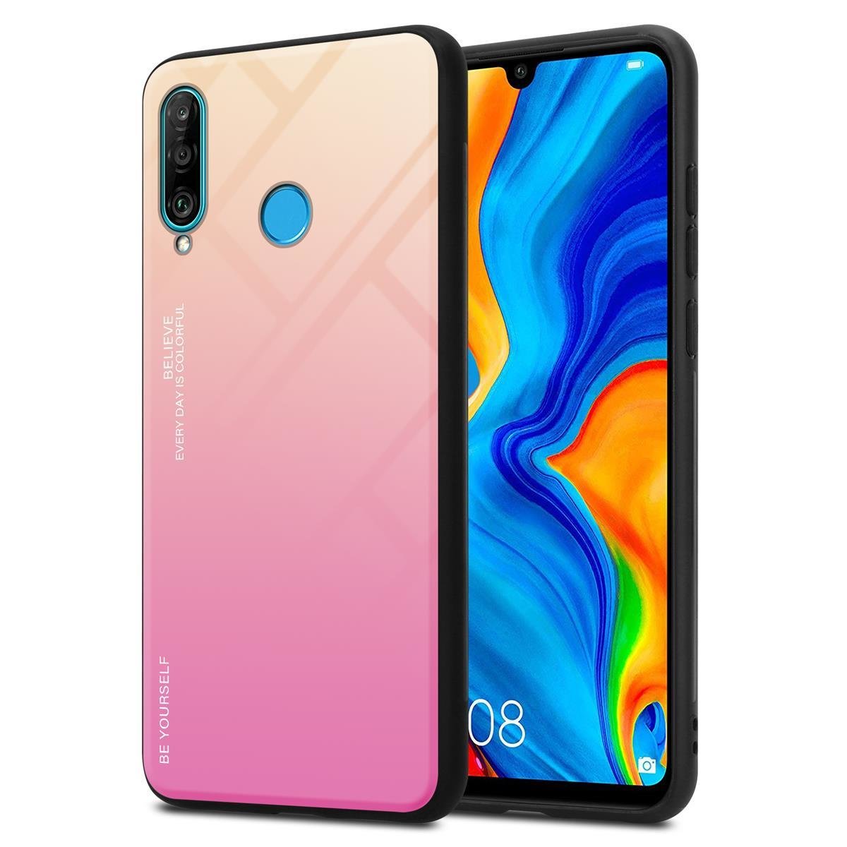 Cadorabo Hülle kompatibel mit Huawei P30 Lite in GELB - ROSA - Zweifarbige Handyhülle aus TPU Silikon und Tempered Glas - Silikonhülle Schutzhülle Ultra Slim Back Cover Case Bumper