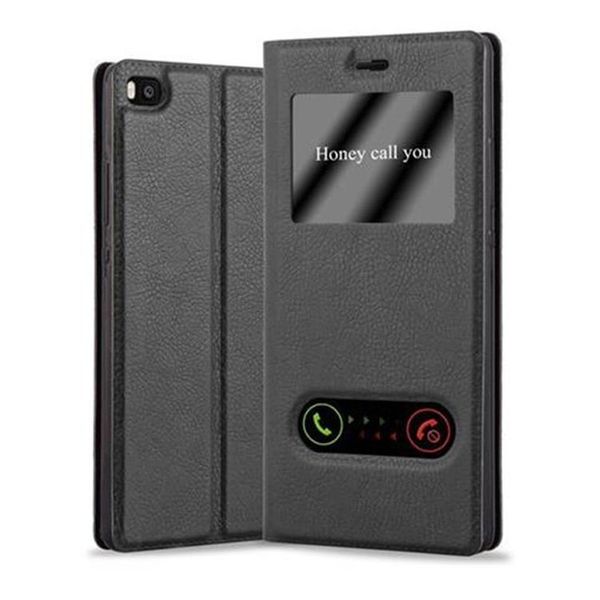 cadorabo Hülle für Huawei P8 in KOMETEN SCHWARZ - Handyhülle mit MagnetverschlussStandfunktion und 2 Sichtfenstern - Case Cover Schutzhülle Etui Tasche Book Klapp Style