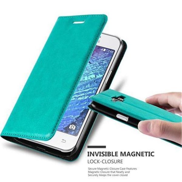 cadorabo Hülle für Samsung Galaxy J1 2015 in PETROL TÜRKIS Handyhülle mit MagnetverschlussStandfunktion und Kartenfach Case Cover Schutzhülle Etui Tasche Book Klapp Style