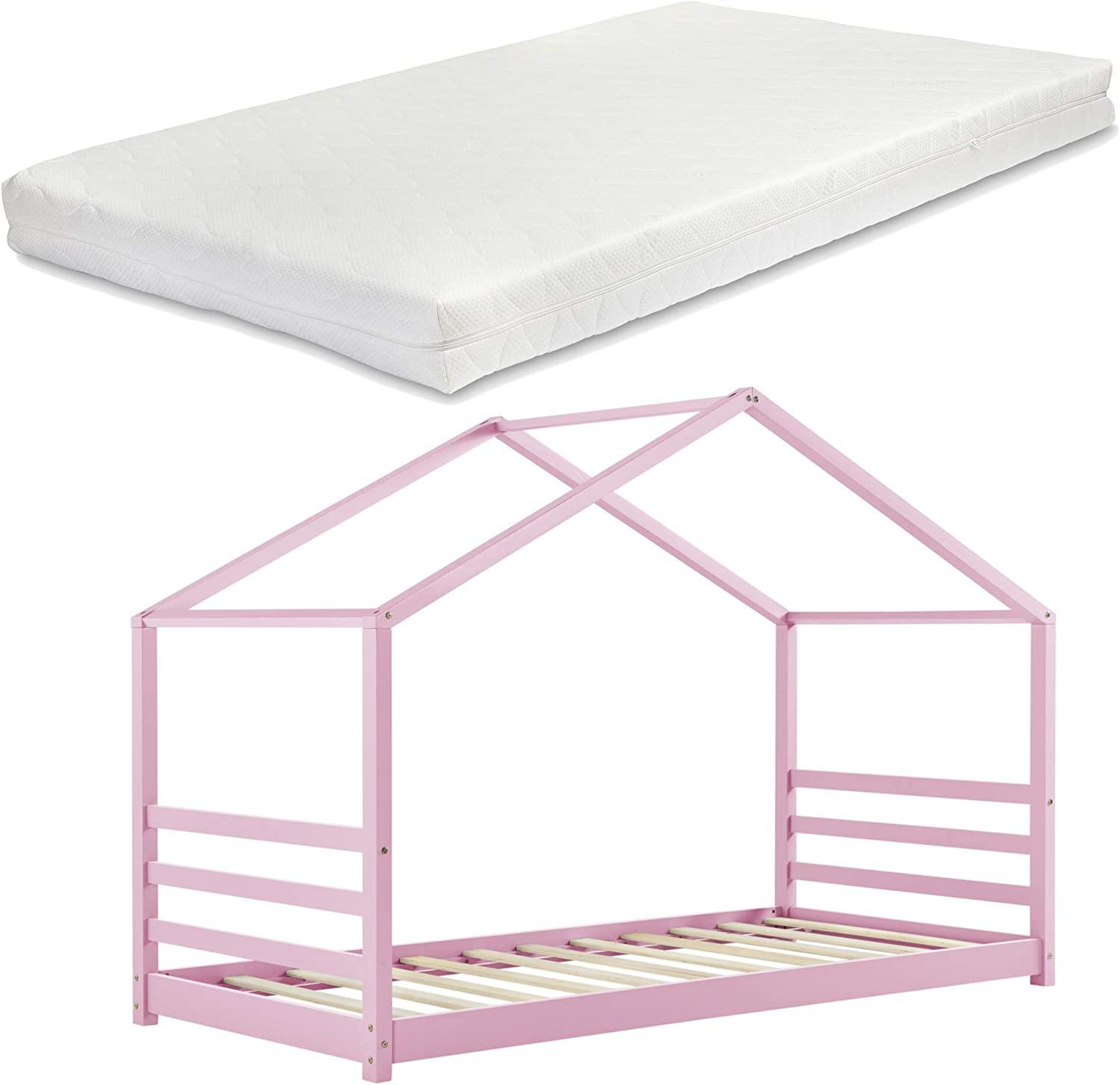 en.casa Hausbett 90x200 cm Rosainkl. Lattenrost und Matratze