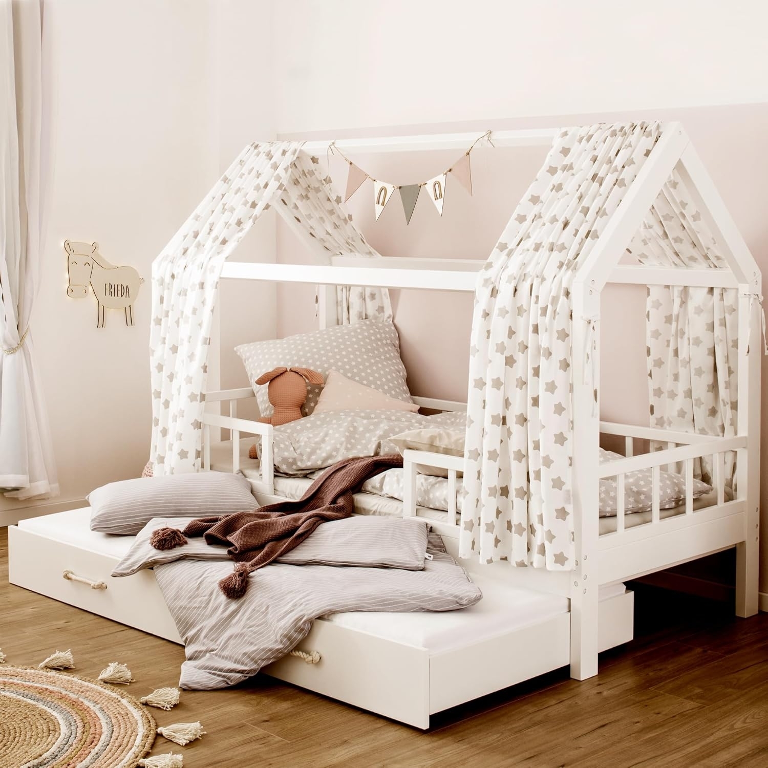 Stylisch und praktisch zu gleich, regt das Kinderbett zum fantasievollen Höhlen bauen an. Das Bett ist durch den abnehmbaren Rausfallschutz für alle Kinder von 4-16 Jahren geeignet. Das Kinderbett besteht zu 100% aus natürlichem Kiefernholz und eignet sich als kuscheliges Hausbett ideal zum Vorlesen, Toben und Kuscheln bei Nacht und Tag. Es überzeugt mit hochwertiger Qualität und modernem skandinavischen Design. Das Kinderbett mit abnehmbaren Rausfallschutz zeichnet sich darüber hinaus durch sein massives, robustes und sicheres Geländer aus. Während das Holz-Bett den Kleinen nachts einen ruhigen und erholsamen Schlaf bietet, dient es tagsüber als Ort zum spielen und herumtroben. Dank des Dachgeländers können die Kinder das Bett zum Bsp. auch schnell zu einer abenteuerlichen Höhle umfunktionieren. Unser Unterbett Carlotta passt sich unserem Hausbett an. Dank der praktischen Rollen lässt sich das Zusatzbett spielend leicht unter dem Hausbett Carlotta hervorziehen. Das Unterbett ist perfekt, wenn Gäste über Nacht bleiben und um Pyjamapartys mit dem Geschwisterkind zu machen. Das Ausziehbett besteht zu 100% aus MDF-Holz sowie die Griffe aus eingedrehten Jutefasern. Das Bett ist für alle Standard-Bettmatratzen in den Maßen 200x90 cm ausgelegt. Für die Unterbett- Matratze empfehlen wir eine Höhe von 14 cm. **Eigenschaften:** - Farbe: Weiß - Belastbarkeit: max. 100 Kg - Maße: Bettrahmen: 211 x 96 x 161,4 cm, Lattenrost: 90x200 cm, Unterbett: 202 x 93,8 x 20,5 cm - Material: Kiefer, MDF