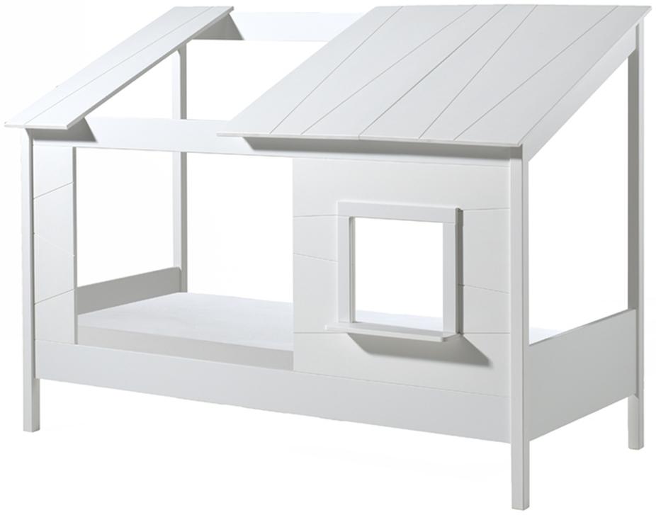 Das Kinderbett 'Baumhaus' von Vipack bietet Mamas und Papas Liebling einen tollen Platz zum Schlafen und Spielen. Das Bettchen ist aus Massivholz und hochwertigem MDF in der Farbe Weiß gefertigt und eignet sich mit einer großzügigen Liegeflache von 90x200 cm für Kinder ab einem Alter von 4 Jahren. Die Liegefläche ist dank der niedrigen Einstiegshöhe von cm 34,5 cm einfach zu erreichen, die Einlegetiefe für Lattenrost und Matratze ist ca. 10 cm. Der nach links versetzte Zugang zum Bett hat eine Breite von ca. 97 cm und eine lichte Höhe von ca. 71,5 cm. Rechts daneben kommt ein optisch ansprechendes Fenster mit Rahmen im Format von 35x35 cm. Die Oberkante von Kopf- und Fußseite ist ca. 50 cm hoch, nach hinten ist das Bett offen. Das nach vorne abfallende Dach hat eine Maximalhöhe von ca. 158,5 cm, vorne ca. 110 cm. Das Dach ist links versetzt offen (Breite ca. 69 cm), die geschlossenen Elemente rechts und links haben schräg zulaufende Fräsungen und können auch nur in der vorgegebenen Position montiert werden. Die durchgehenden Bettpfosten und massive Bauweise bieten eine hohe Stabiliät, Die Fräsungen in den einzelen Baugruppen sind Holzplanken nachempfunden, sie vermitteln eine Optik, wie sie bei Baumhäusern typisch ist. Warnhinweis: Das Dach darf nicht bestiegen werden. **Allgemeine Qualitätsmerkmale** - klassisches Design - hochwertiges MDF - Metallscharniere und -beschläge - strapazierfähige und unempfindliche Oberflächen - hochwertige Verarbeitung - hohe Kratz- und Stoßfestigkeit **Materialdaten | Oberflächen:** - Material: Bett Kiefer massiv und hochwertiges MDF, lackiert - Farbe: weiß - Beschläge & Scharniere: Metall - Gesamtmaß B/H/T ca.: B: 214 x H: 158,5 x T: 108 cm
