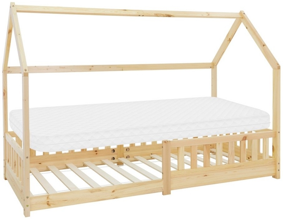 in HausbettenML-DESIGN Kinderbett Hausbett mit RausfallschutzDach und Lattenrost Massivholz, Bett 90x200 cm Natur mit Matratze 10cm Mädchen Jungen Holzbett