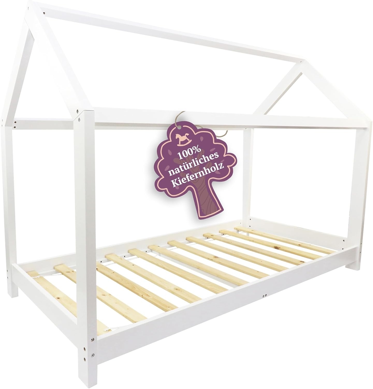 Der perfekte Ort zum Vorlesen, Toben und Kuscheln! Unser Hausbett Finn lädt zu einem erholsamen Schlaf bei Nacht wie auch zu Spiel und Spaß am Tag ein. Im modernen skandinavischen Design ist das Kinderbett der Blickfang in jedem Kinderzimmer. Das Bett ist für alle Kinder und Teenager von 3-16 Jahren geeignet. Die Querbalken und der Giebel des Hausbettes ist so an das Bett angebracht, dass auch Mama und Papa ausreichend Kopffreiheit haben. Das Bett ist für alle Standard-Bettmatratzen in den Maßen 200x90 cm ausgelegt. - Material: Holz - Bestandteile: Bettrahmen im Hausbettdesign, Rolllattenrost - Zertifiziert: FSC zertifiziert - Art: Kinder- und Jugendbett - Farbe: Weiß - Belastbarkeit: max. 100 kg - Maße: Bettrahmen - 208 x 96 x 146 cm, Lattenrost - 90x200 cm - Pflege: Mit einem feuchten Baumwolltuch abwaschbar. Anschließend trocken nachwischen. - Hinweis: Die Lieferung enthält keine Matratze. Das Bett ist für eine Matratze in den Maßen 90x200 cm ausgelegt.